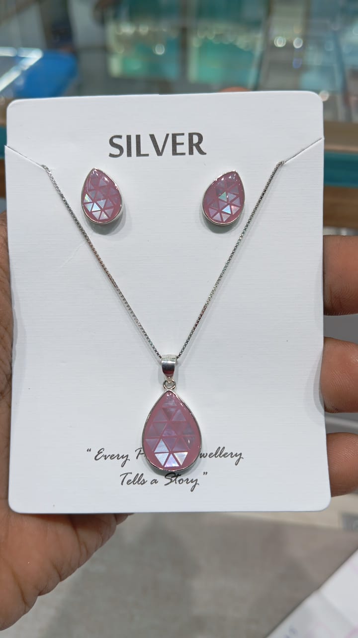 Soft Pink Teardrop Silver Pendant Set with Earrings