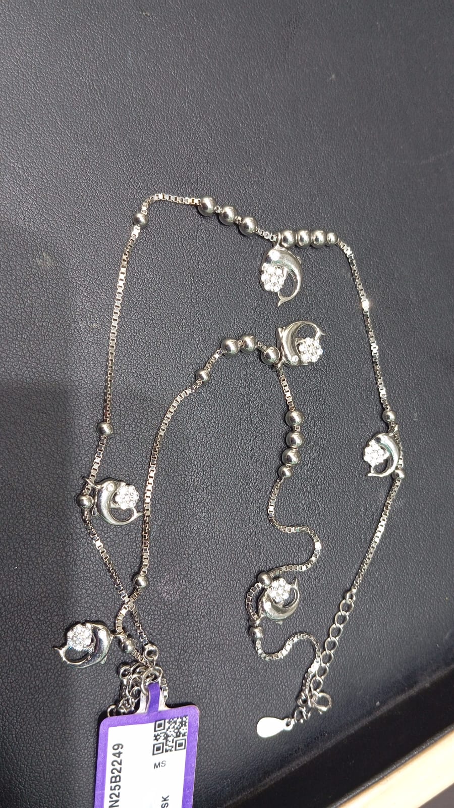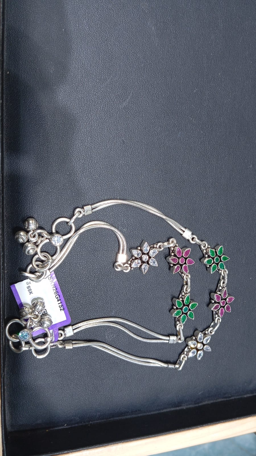 Double Layer Silver Anklets with Green & Ruby-Coloured Stones