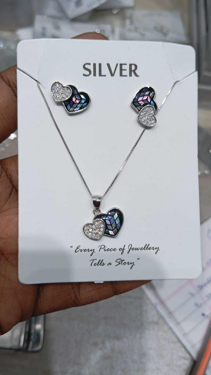 Dual Black Heart Silver Pendant with Swarovski Stone Earrings