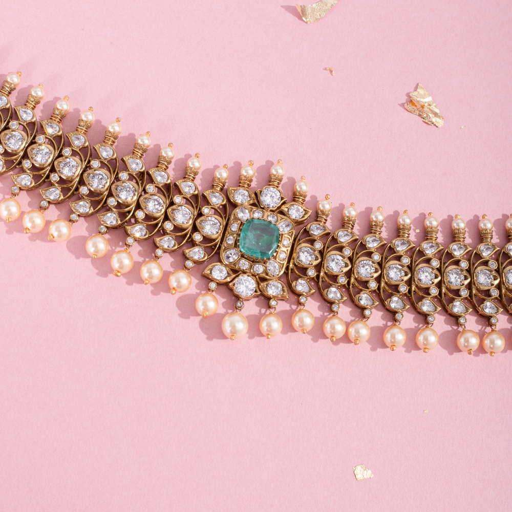 Emerald & Swarovski Stone Gold Plated Necklace with Stud Earrings