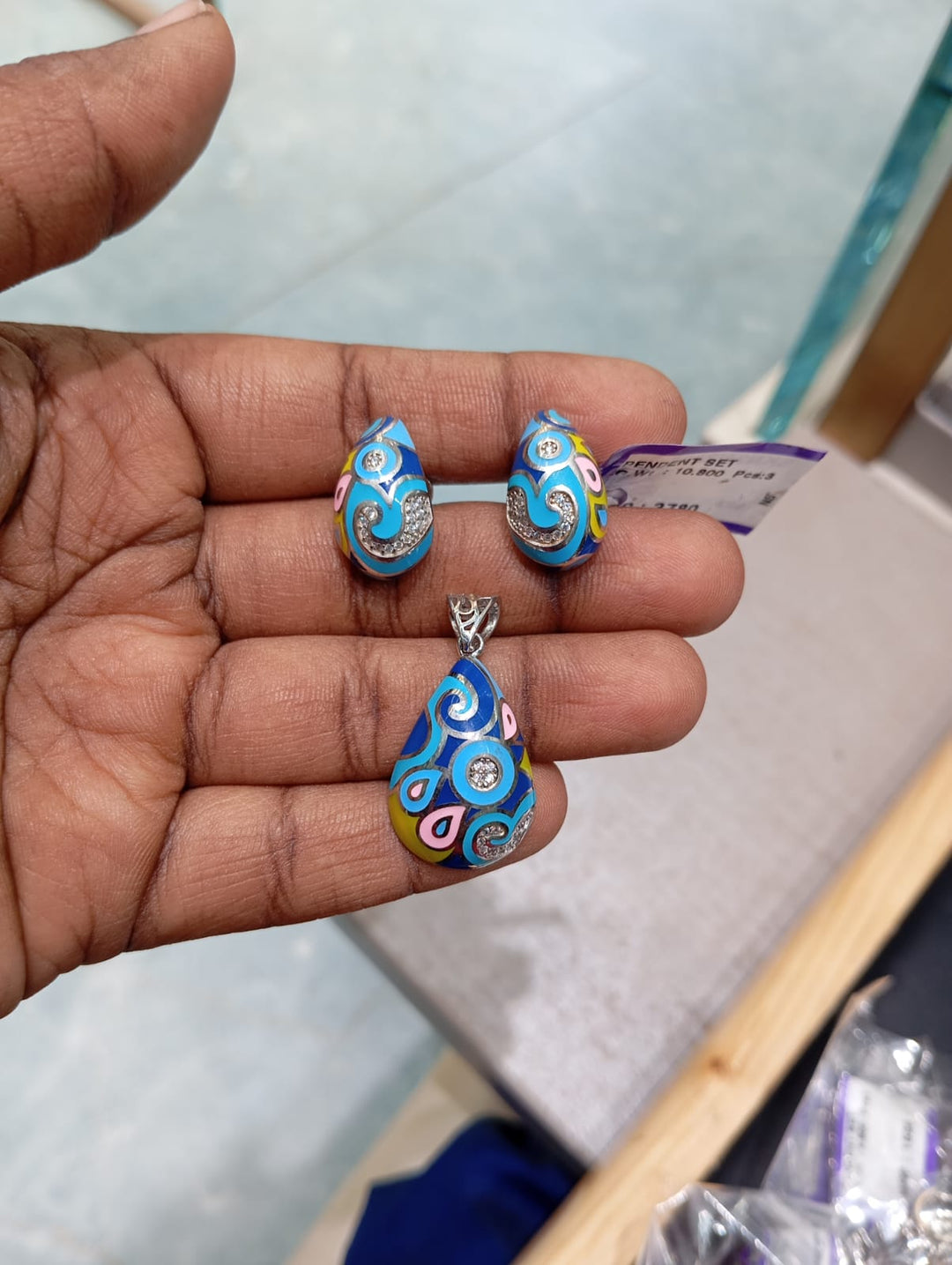 Peacock Inspired Enamel Pendant with Matching Earrings