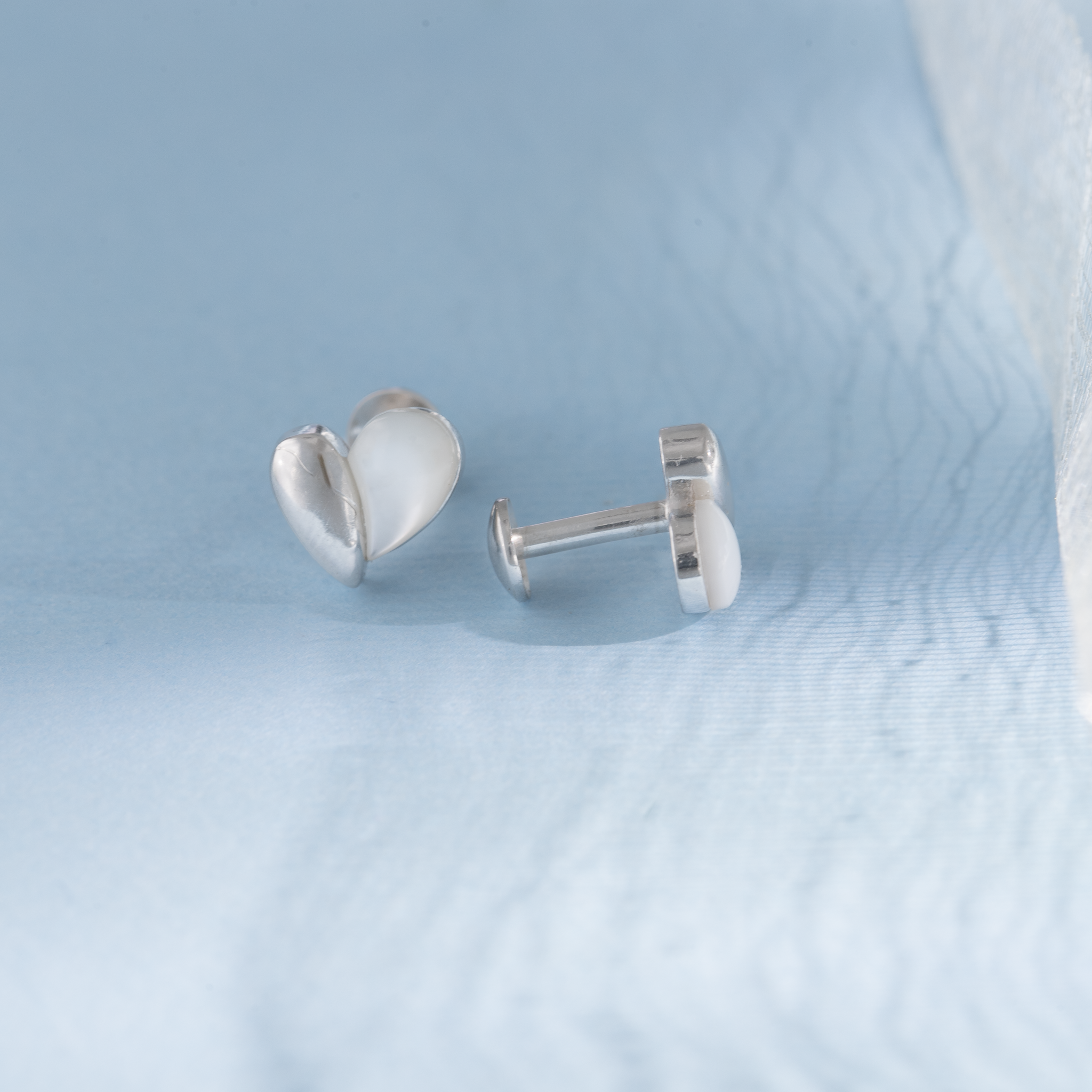 • Design: Two-tone heart stud (half silver, half mother-of-pearl)