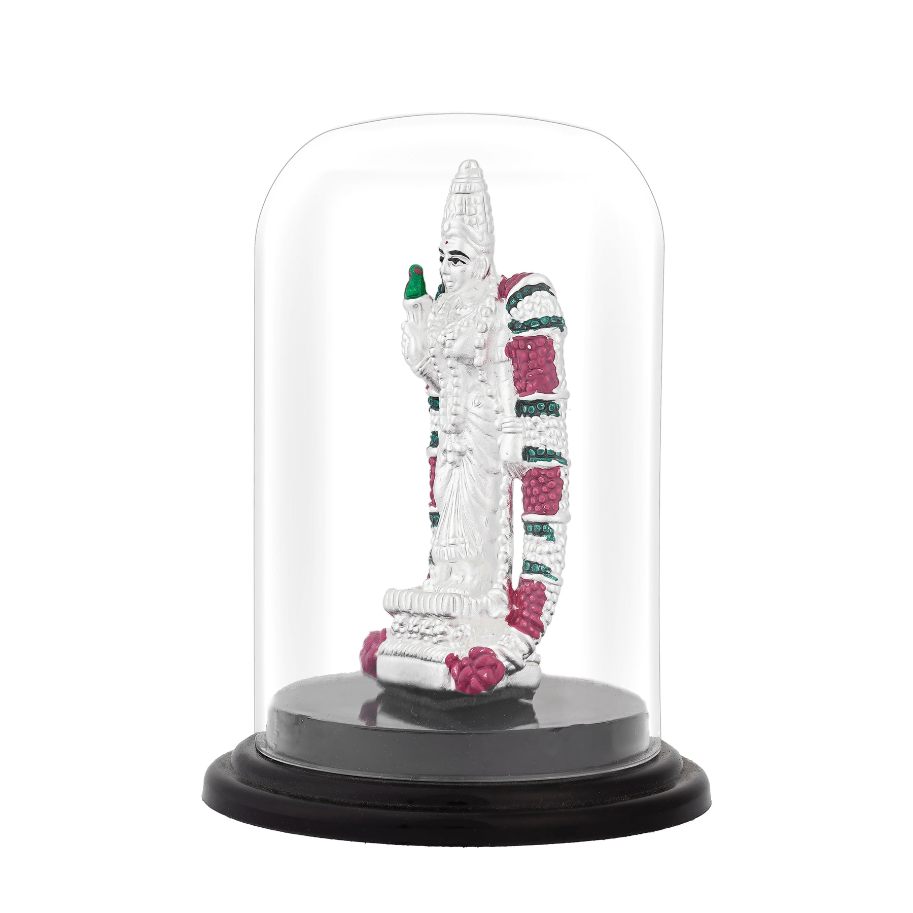 Encased in a durable glass dome with a sturdy black base, this Meenakshi idol stays protected while retaining its elegance. It is an ideal choice for daily worship, festive occasions, or as a thoughtful gift during weddings, housewarmings, and spiritual celebrations.
