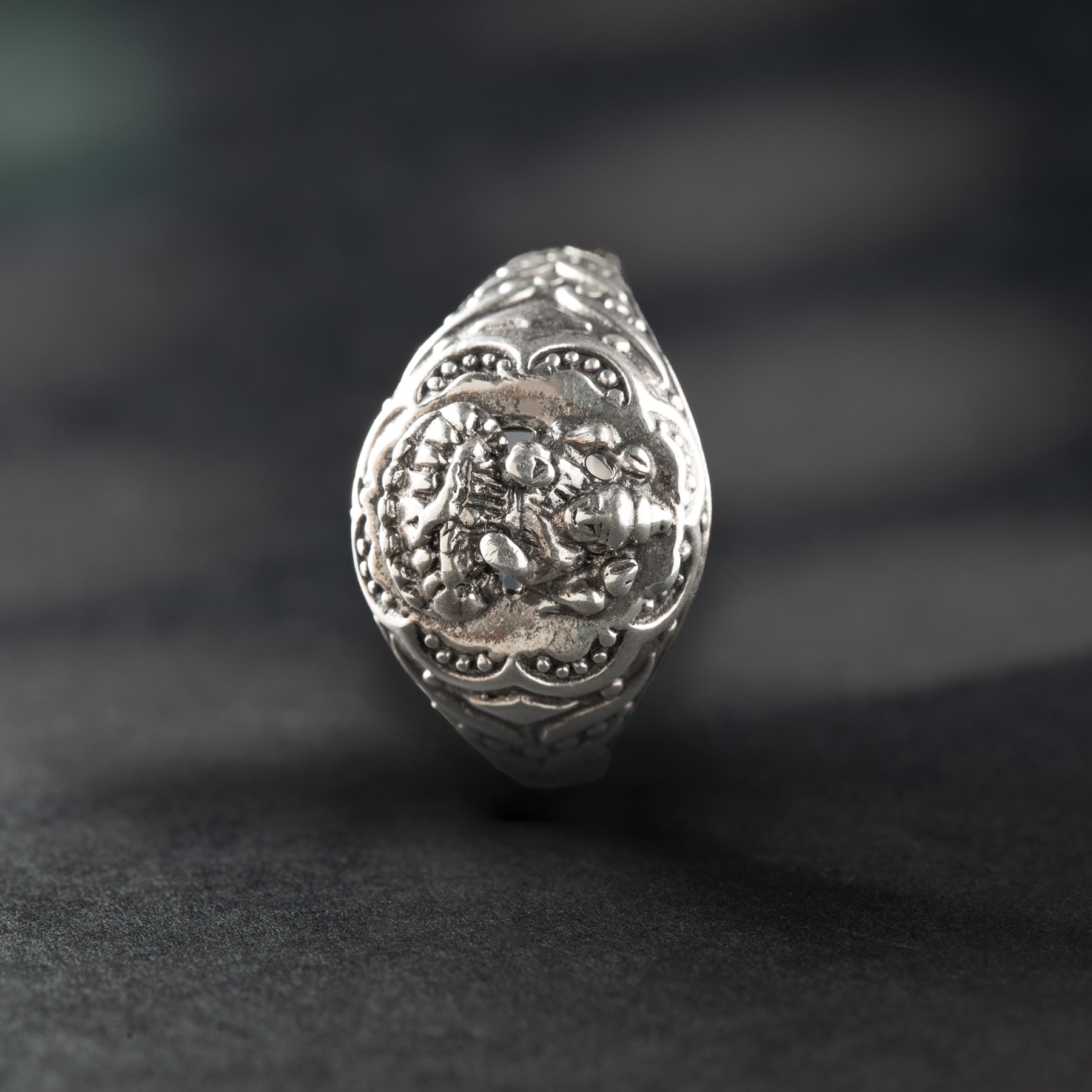 Designed with an antique oxidized finish, the ring radiates vintage charm while offering spiritual strength and aesthetic appeal. Its intricate craftsmanship highlights every curve of the divine figure, making it a meaningful accessory for both men and women who seek balance, luck, and divine energy in their daily lives.