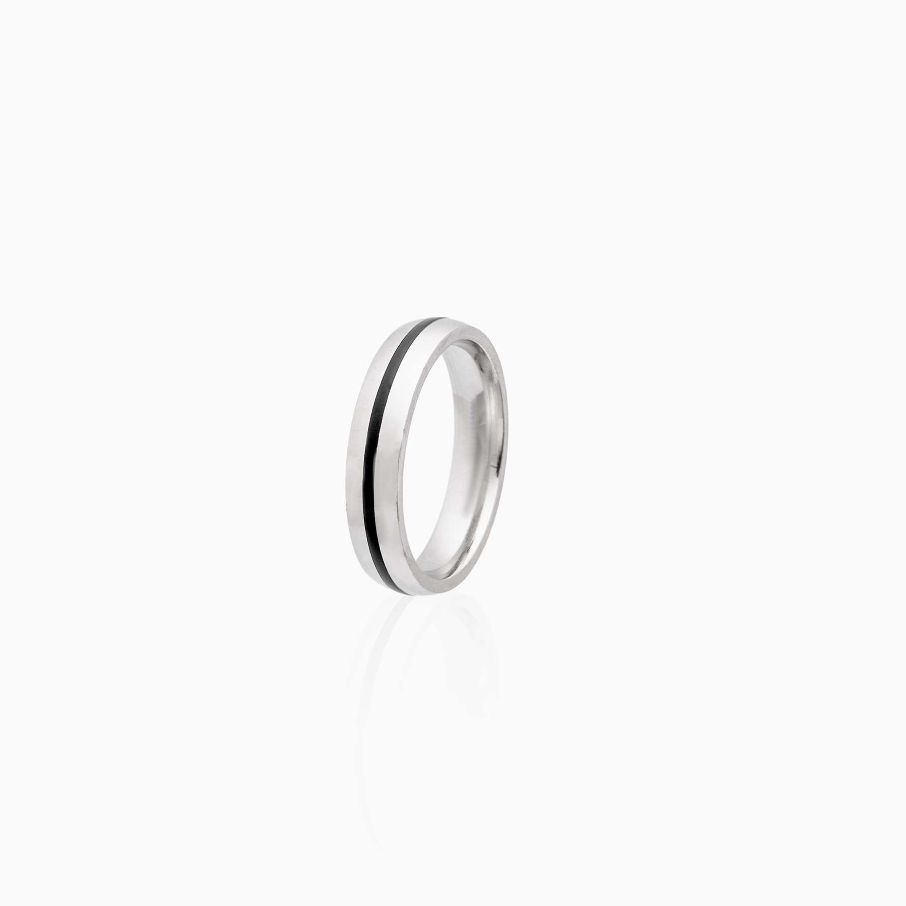 The ring features a mirror-polished silver band with a contrasting black groove running along its centre. The smooth interior ensures comfortable wear, while the dual-tone design symbolizes balance and inner focus.