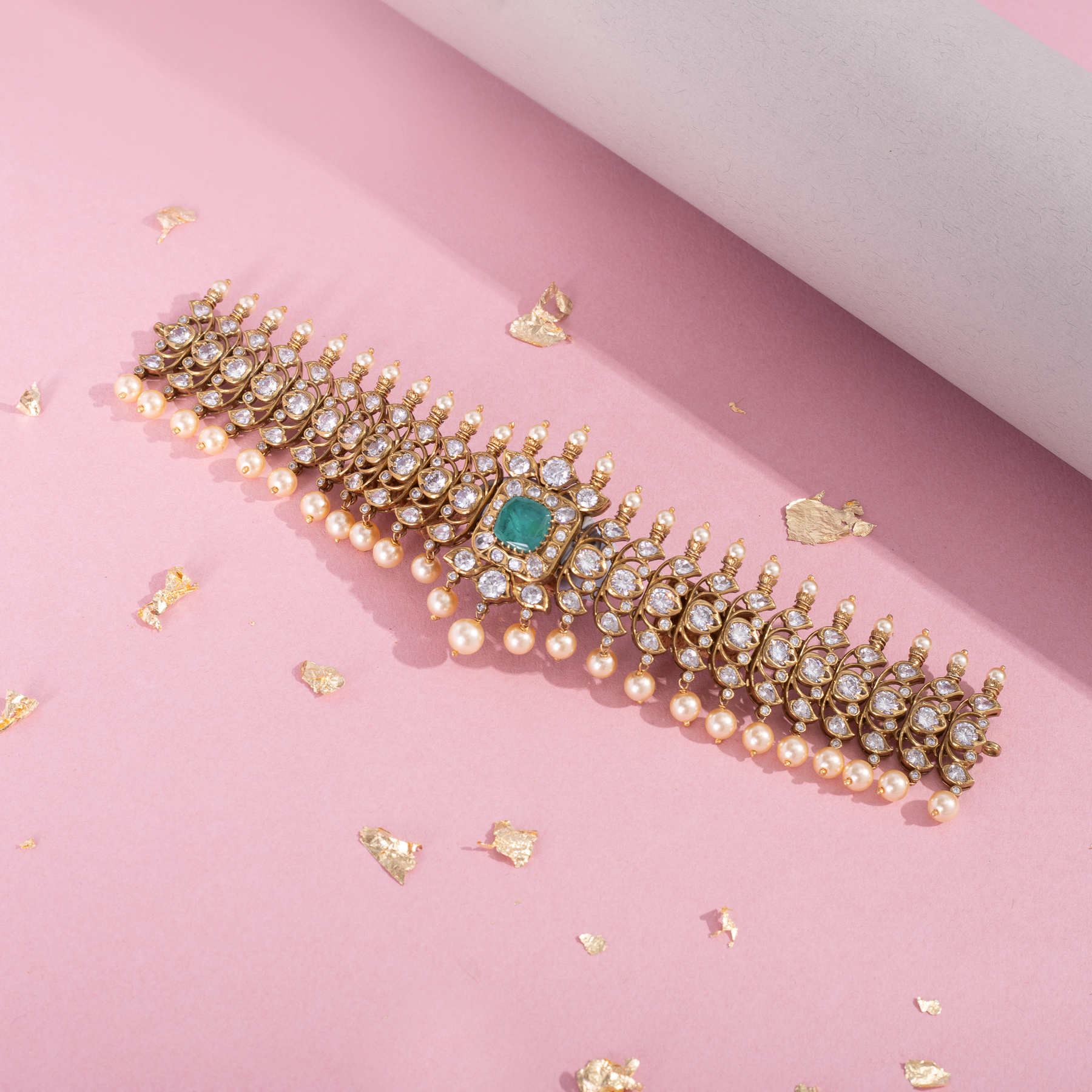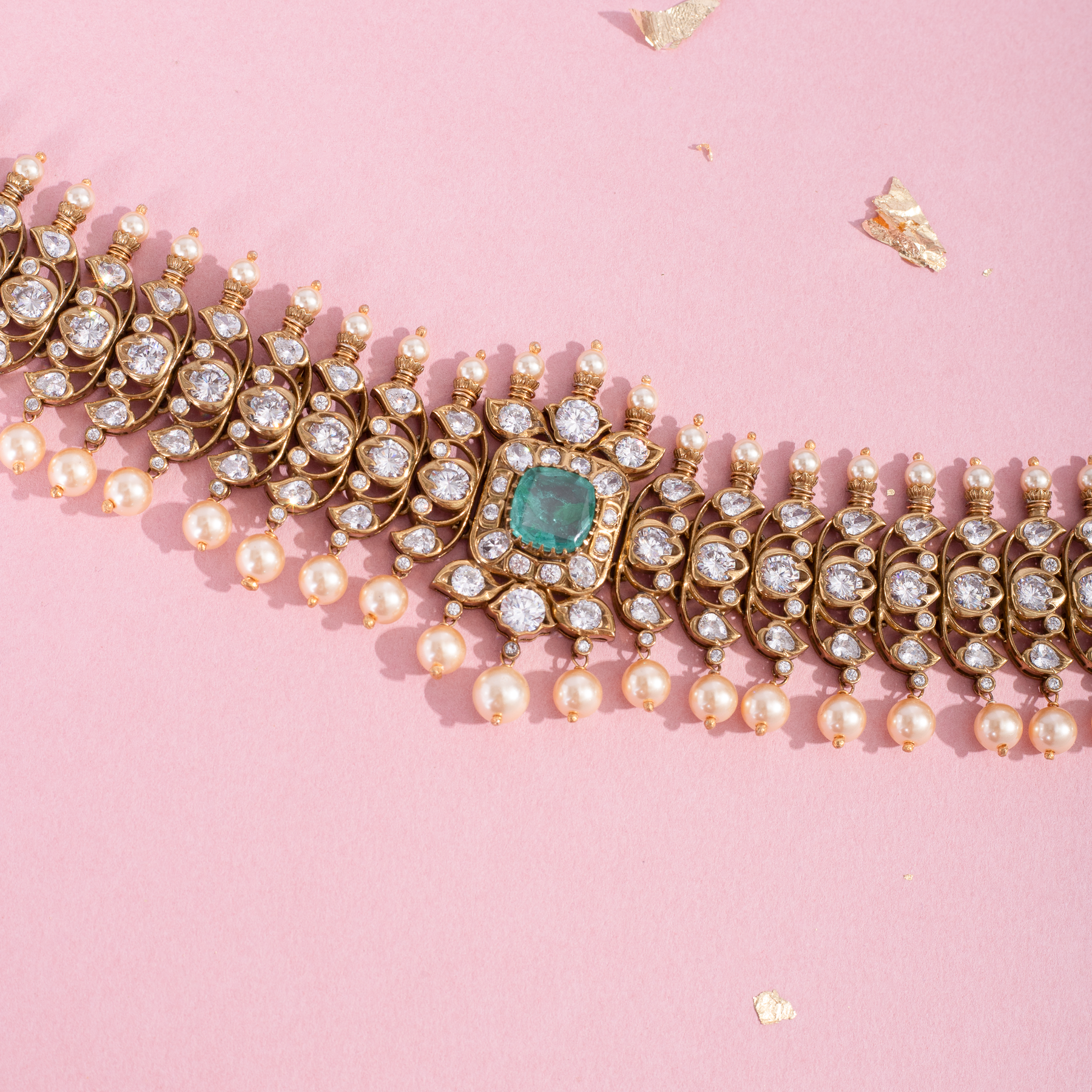 The choker features a stunning square-cut emerald centre stone surrounded by CZ crystals and classic pearl drops, creating a royal heritage design. The gold-plated finish gives a radiant antique glow, while the intricate craftsmanship adds depth and luxury. The set includes a pair of matching long earrings, completing the perfect traditional ensemble.