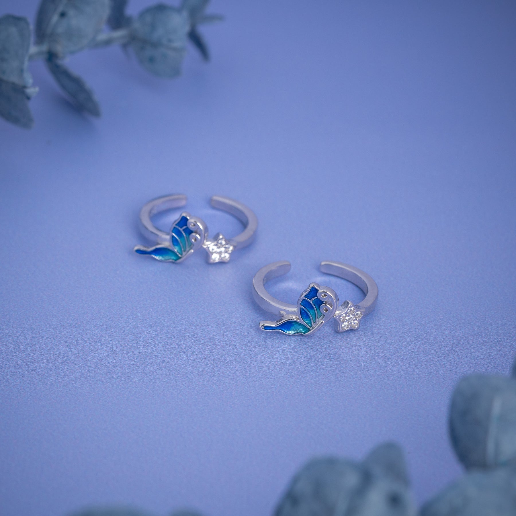 Add a graceful and stylish touch to your jewellery collection with this Fancy Butterfly Toe Ring. Crafted in a sleek silver finish, this piece is designed with a beautifully detailed enamel butterfly in striking shades of blue and sky tones, symbolizing beauty, transformation, and elegance.