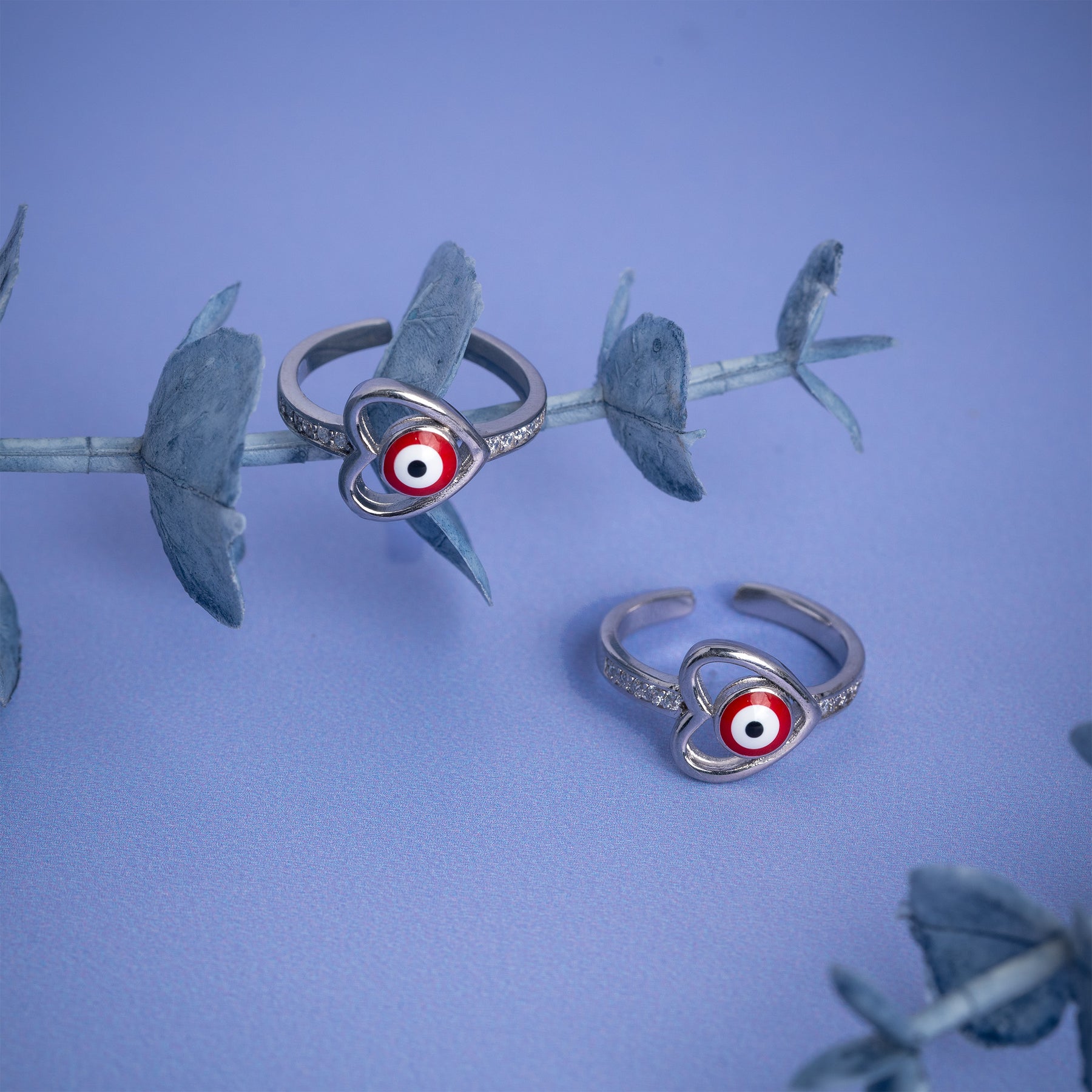 Add a touch of charm and protection to your jewellery collection with this Fancy Evil Eye Toe Ring. Designed with a delicate silver band accented with shimmering stones, this toe ring features a heart-shaped frame enclosing a striking red evil eye symbol.