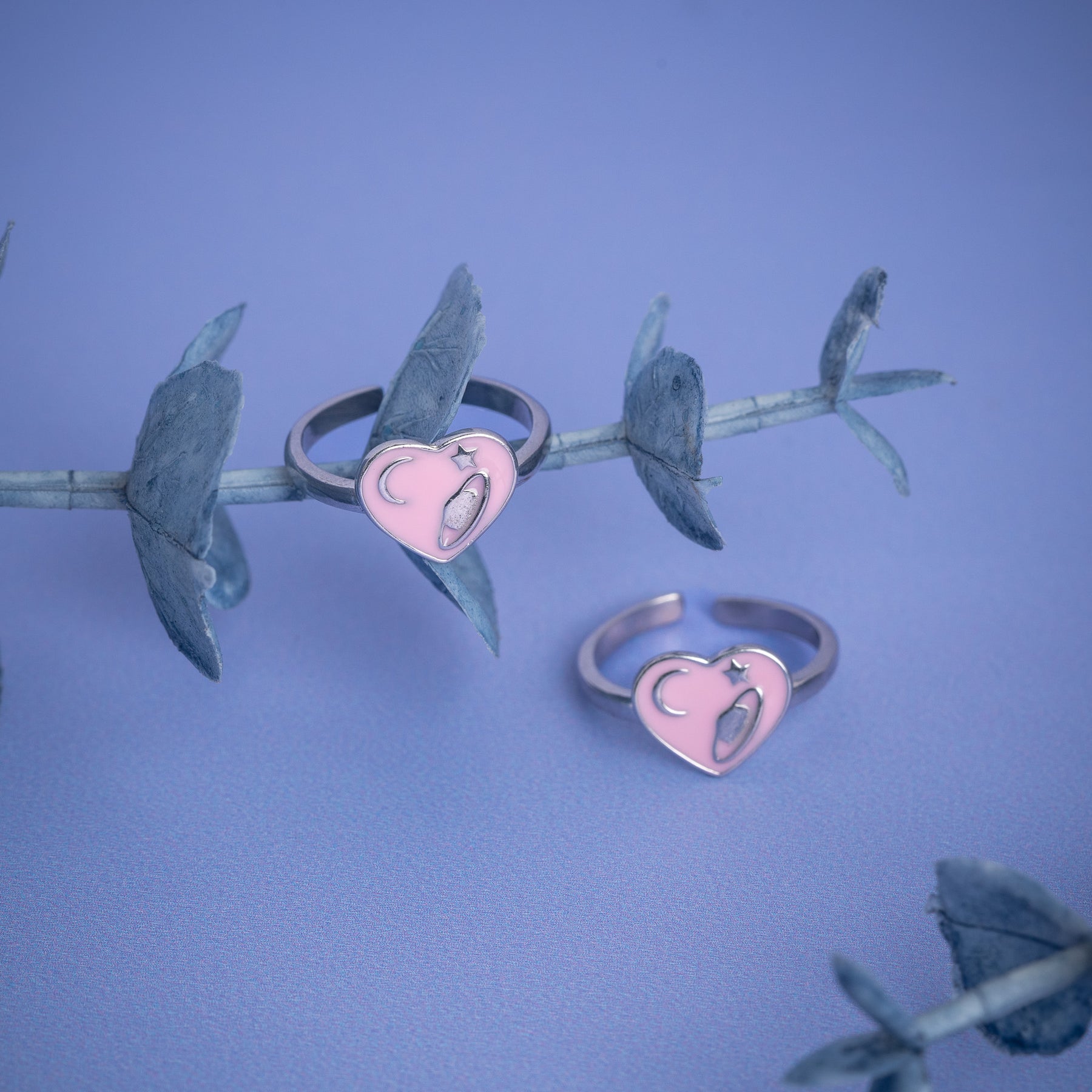 Design: Heart-shaped toe ring with pink enamel, moon & star accents