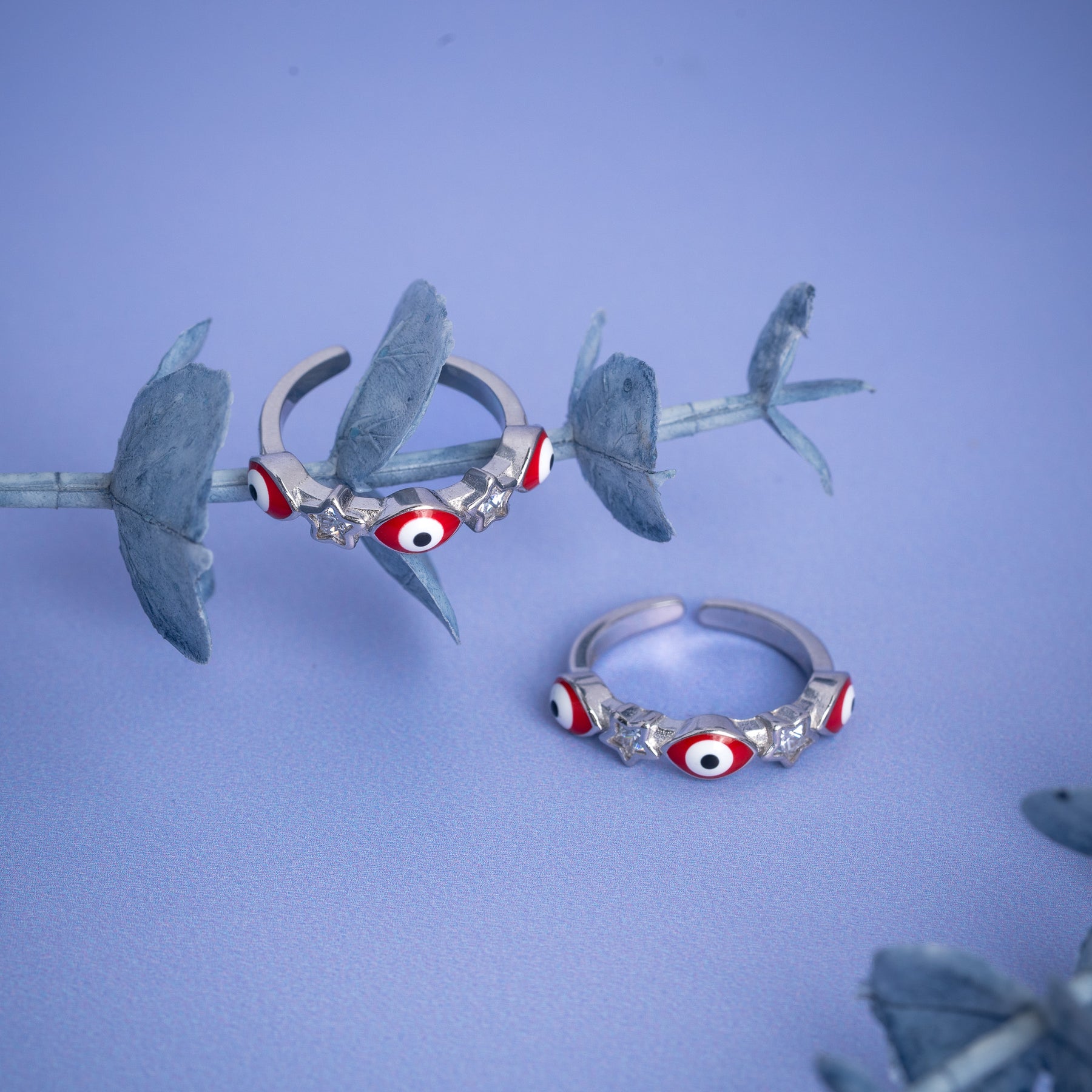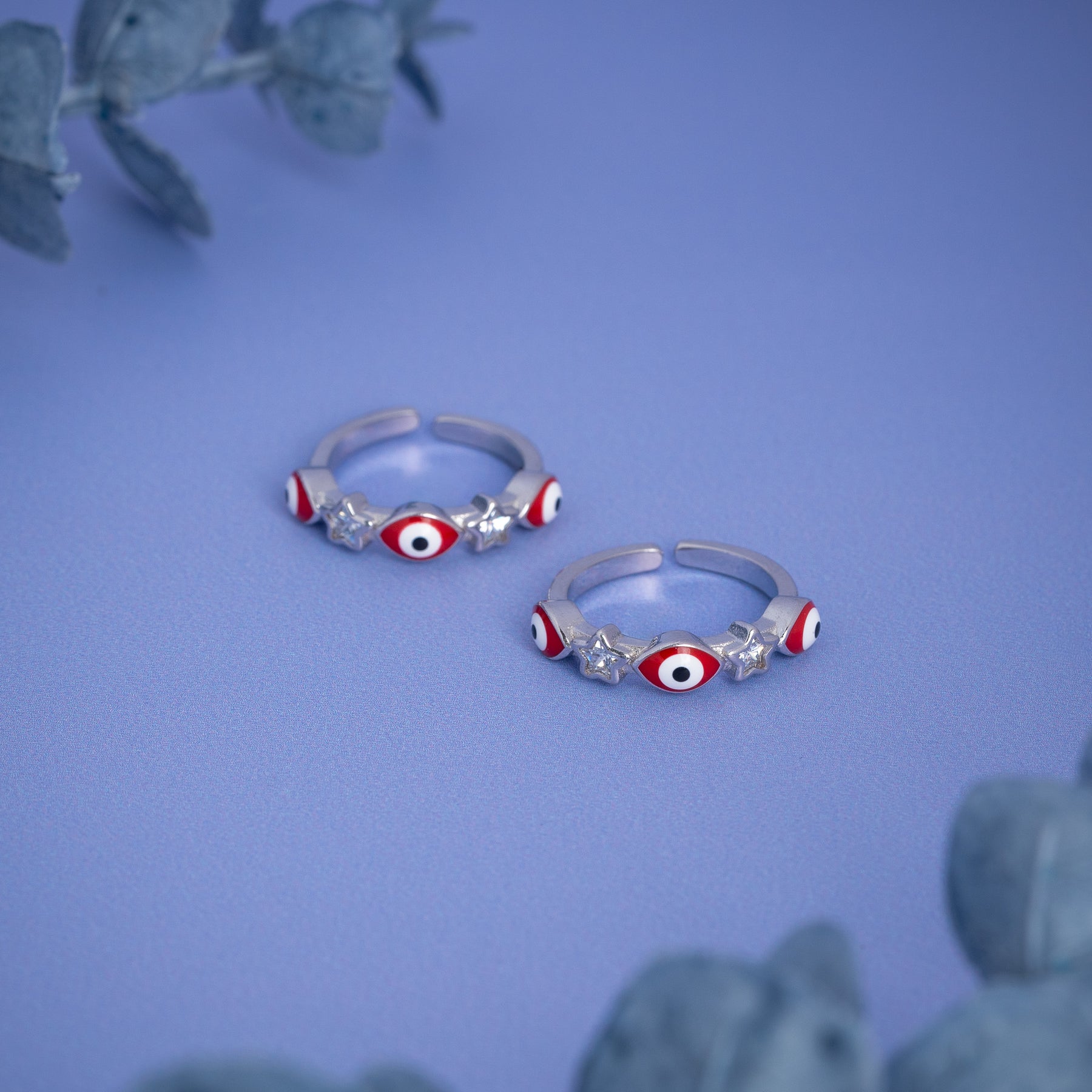 Enhance your jewellery collection with this Fancy red Evil Eye Toe Ring. Designed with a polished silver band adorned with shimmering stones, the centrepiece showcases a delicate circular frame holding a red evil eye charm.