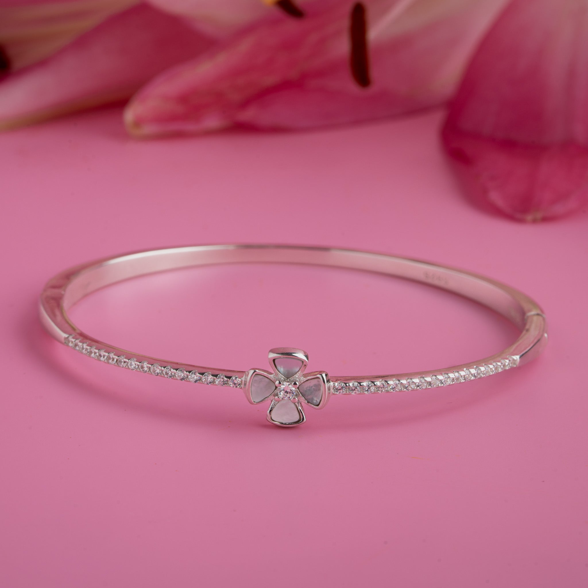Design: Four-petal flower motif with shimmering CZ accents