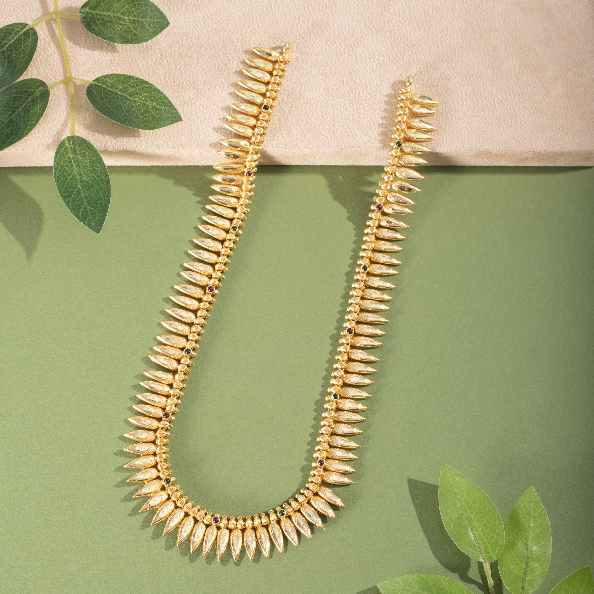 • Design: Traditional long malai with leaf motifs