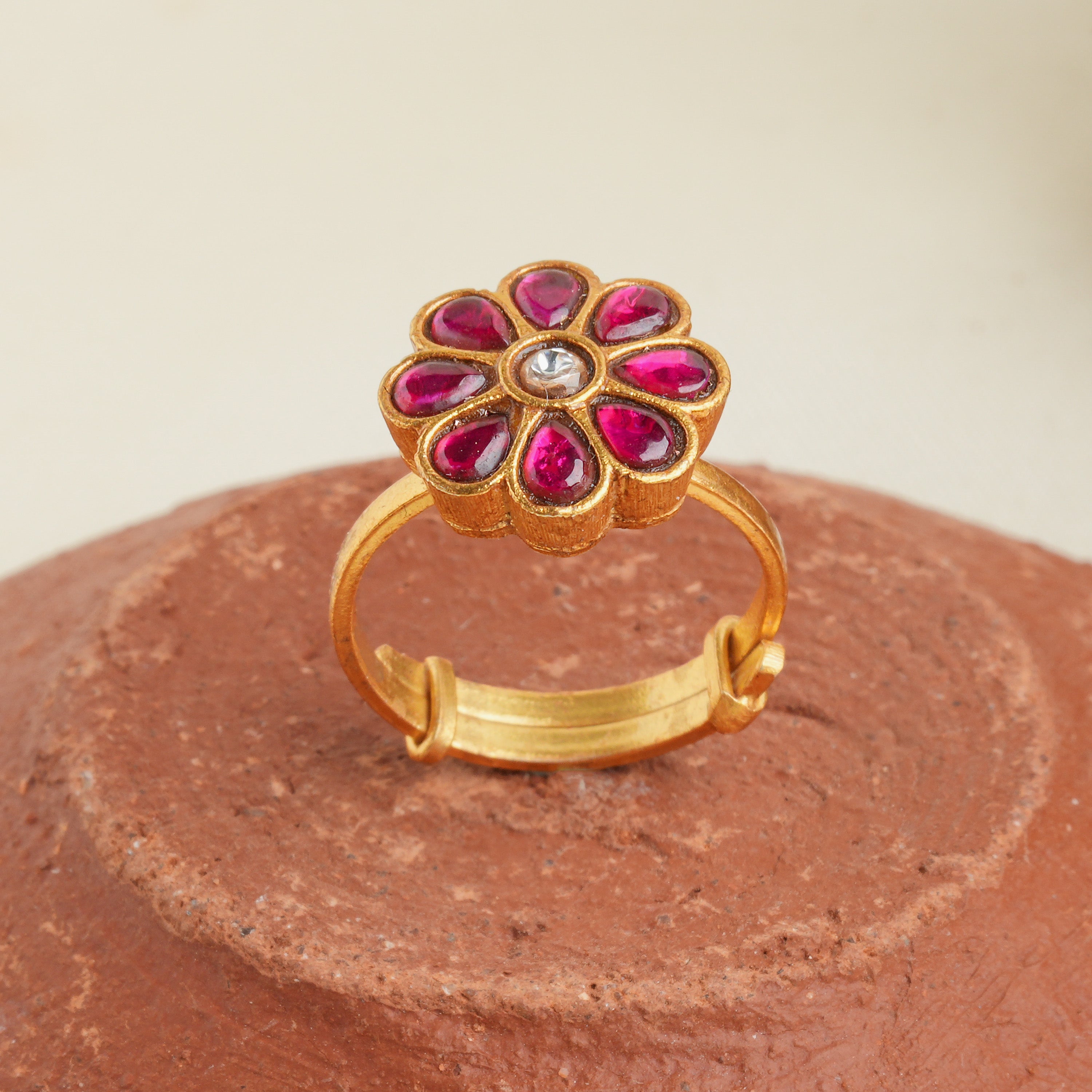 Design: Floral motif with ruby red stones and a central CZ crystal