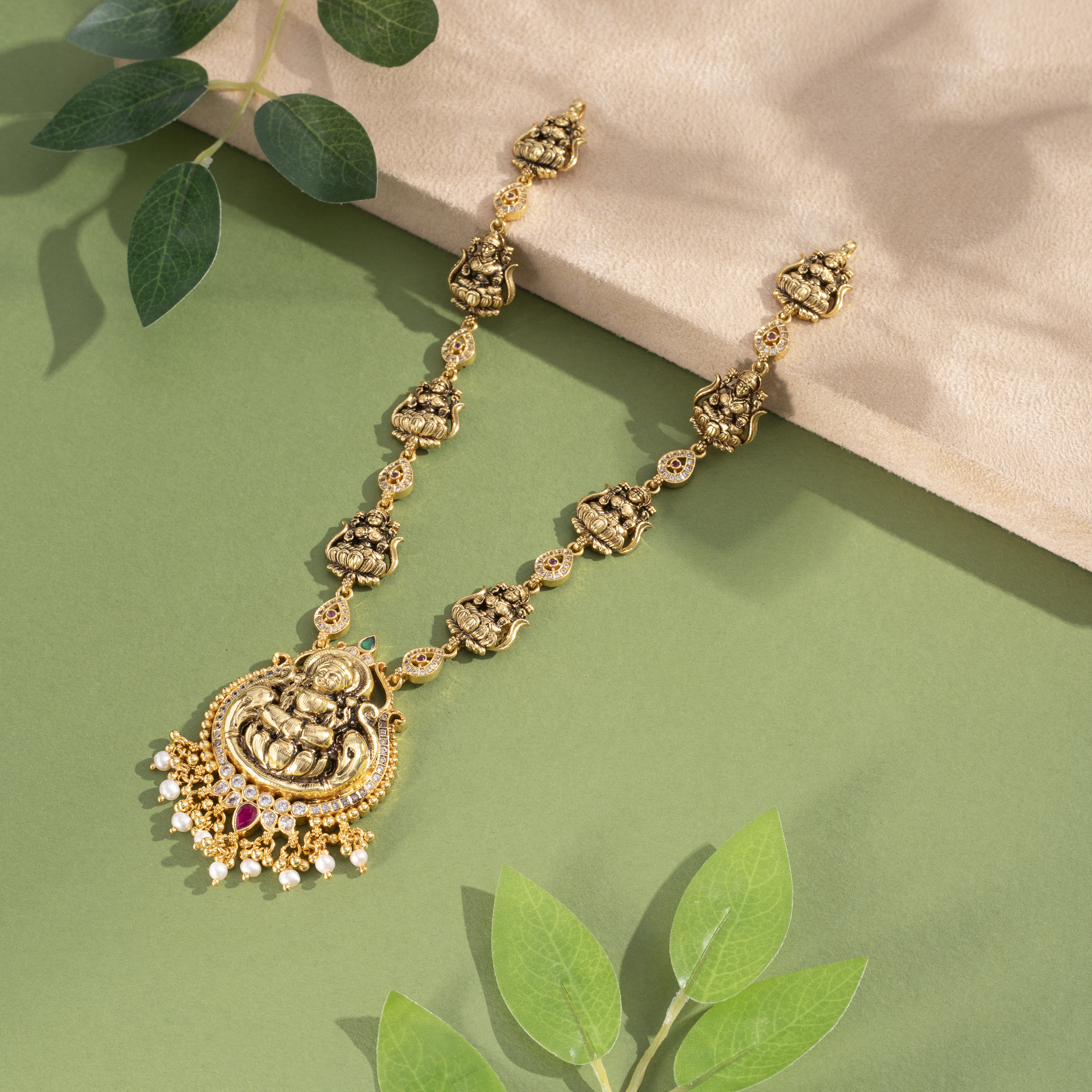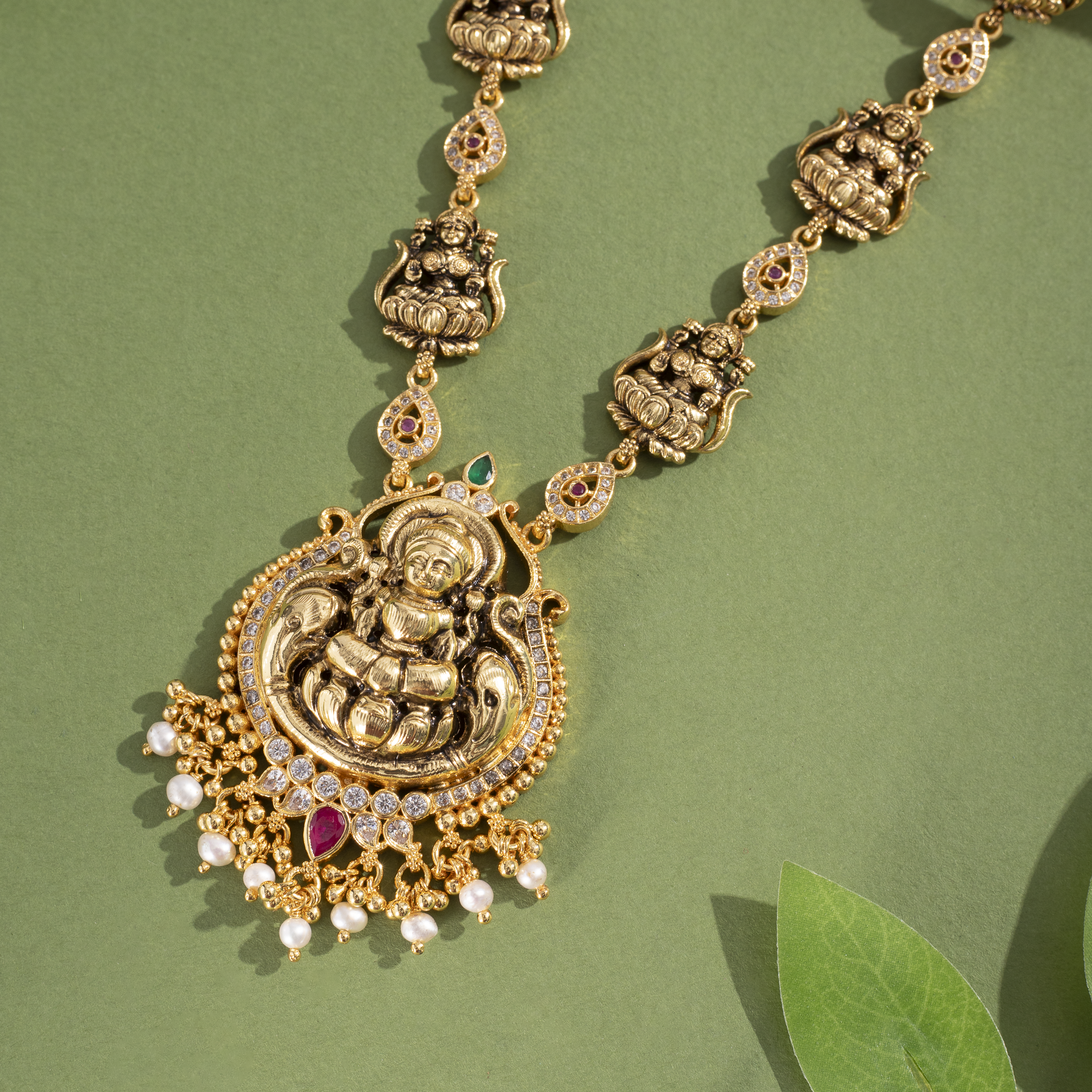 Design: Temple-style Lakshmi malai with intricate motifs
