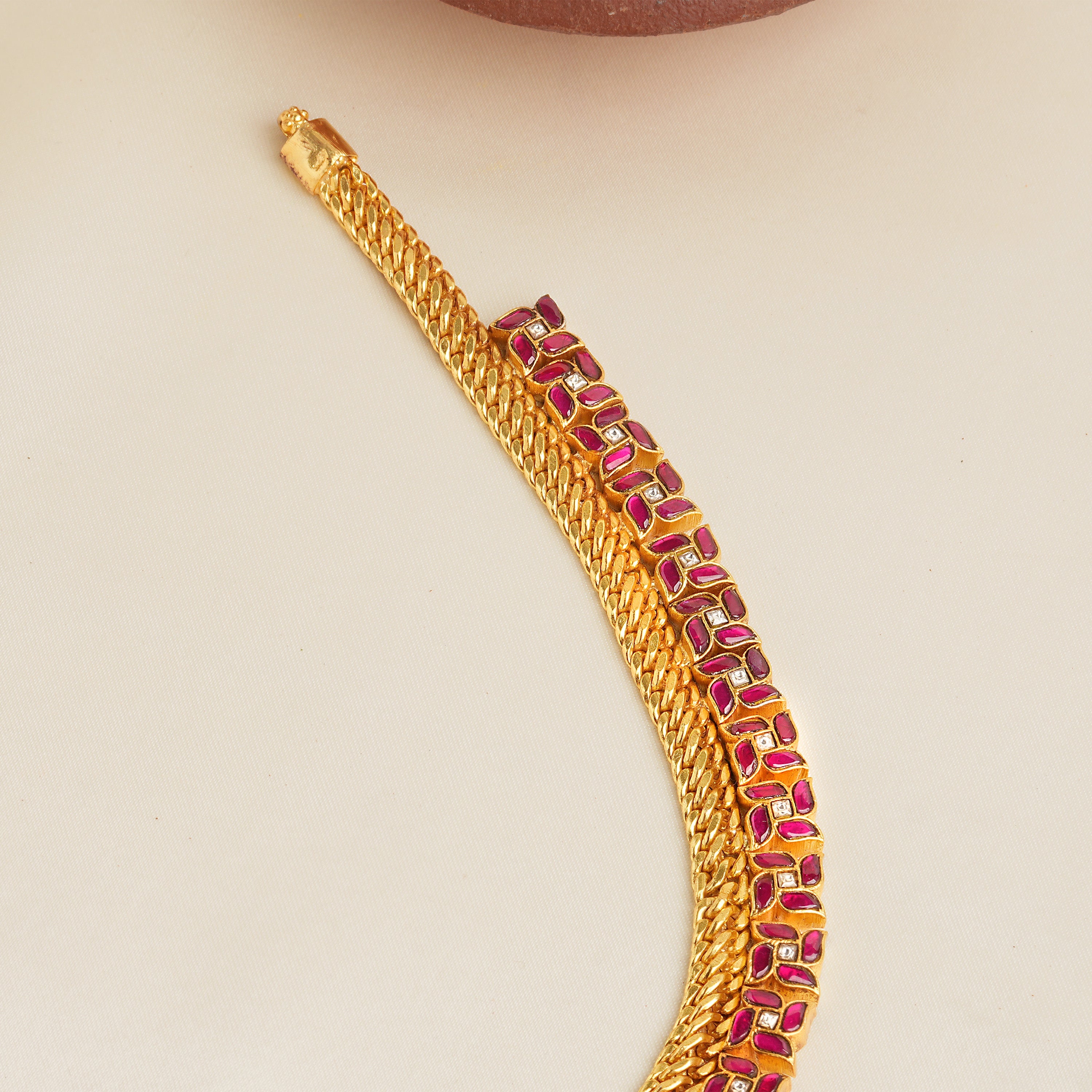 Design: Classic Kundan necklace with ruby stones and woven gold chain