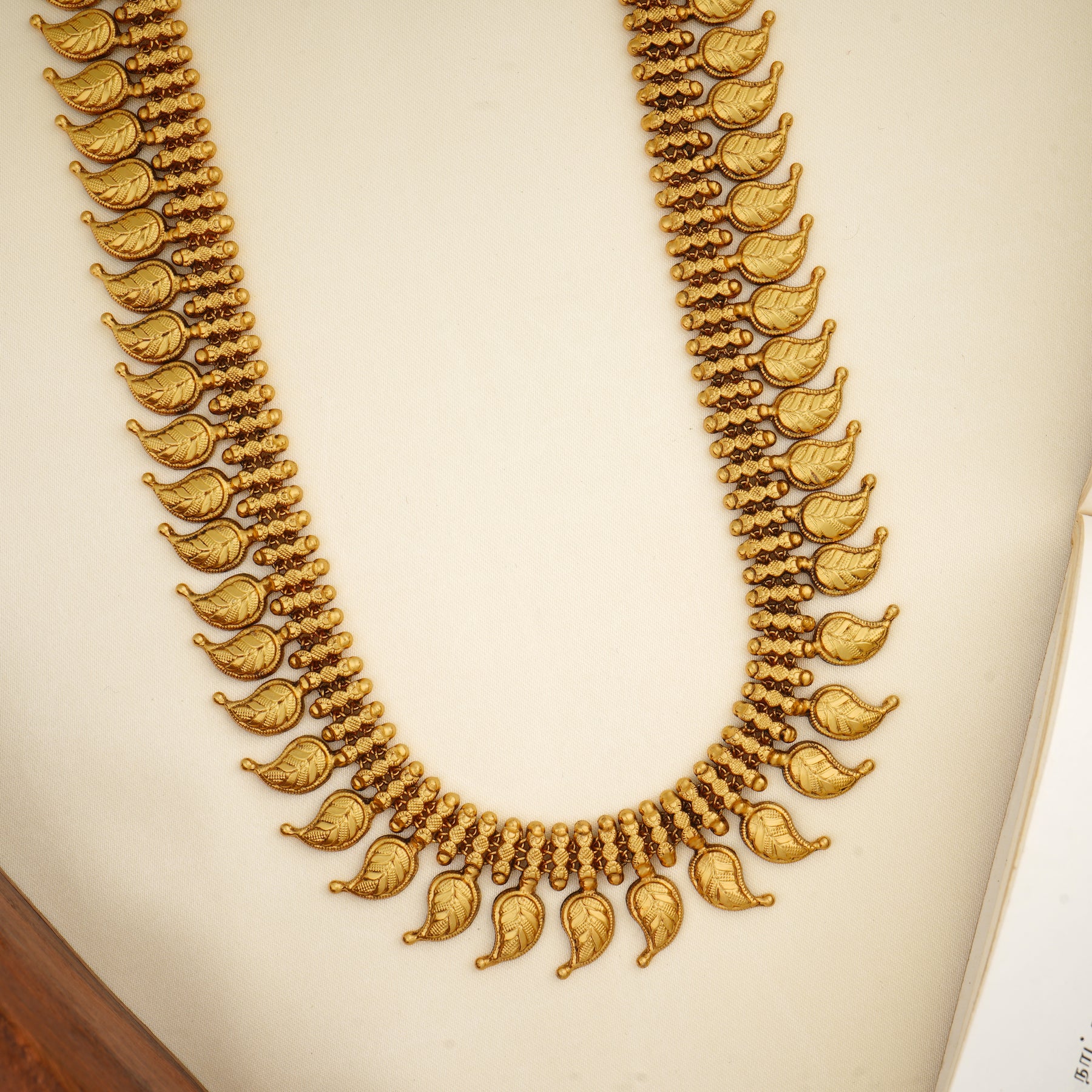 Ideal for bridal wear, temple festivals, or cultural occasions, this mango malai haram sits gracefully along the neckline, making it a standout piece in any jewellery collection. Its antique finish and heritage design speak to the richness of Indian craftsmanship. A versatile treasure for those who cherish classic elegance with spiritual significance.