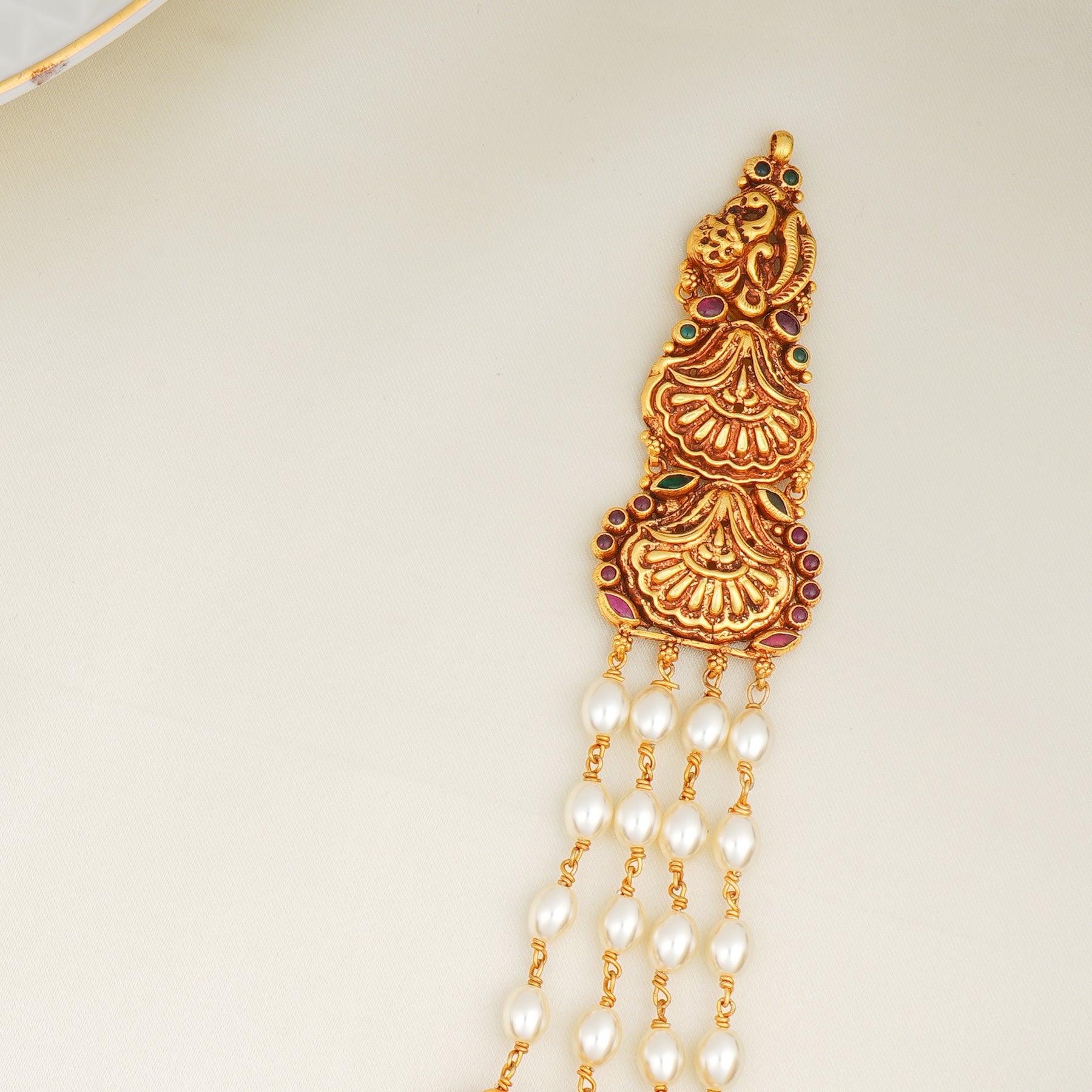 The ends are adorned with detailed floral peacock motifs in antique gold finish, enhancing the rich traditional vibe. Whether styled with a silk saree or lehenga, this haram adds a regal touch to your ensemble.