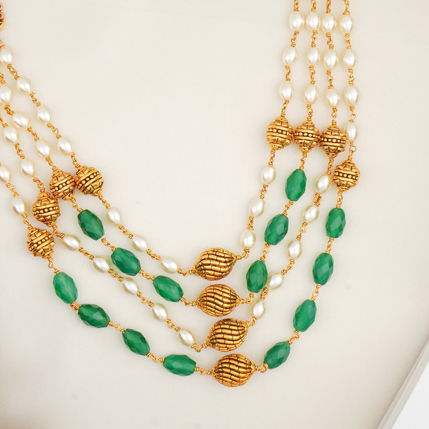 Elevate your bridal or festive look with this elegant Layered Beads Haram, a perfect blend of tradition and charm. Featuring three beautifully cascading strands of green beads, pearls, and intricately carved floral gold plated balls, this haram embodies grace and grandeur.