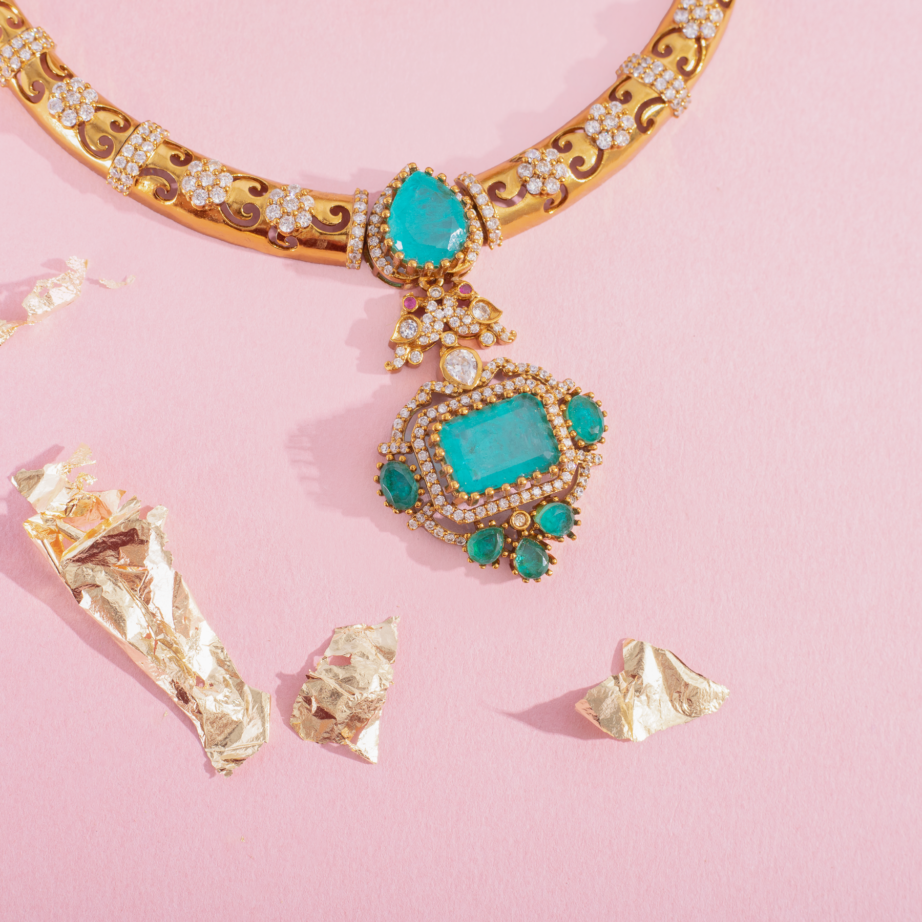 Design: Gold-plated necklace with green stones and CZ embellishments