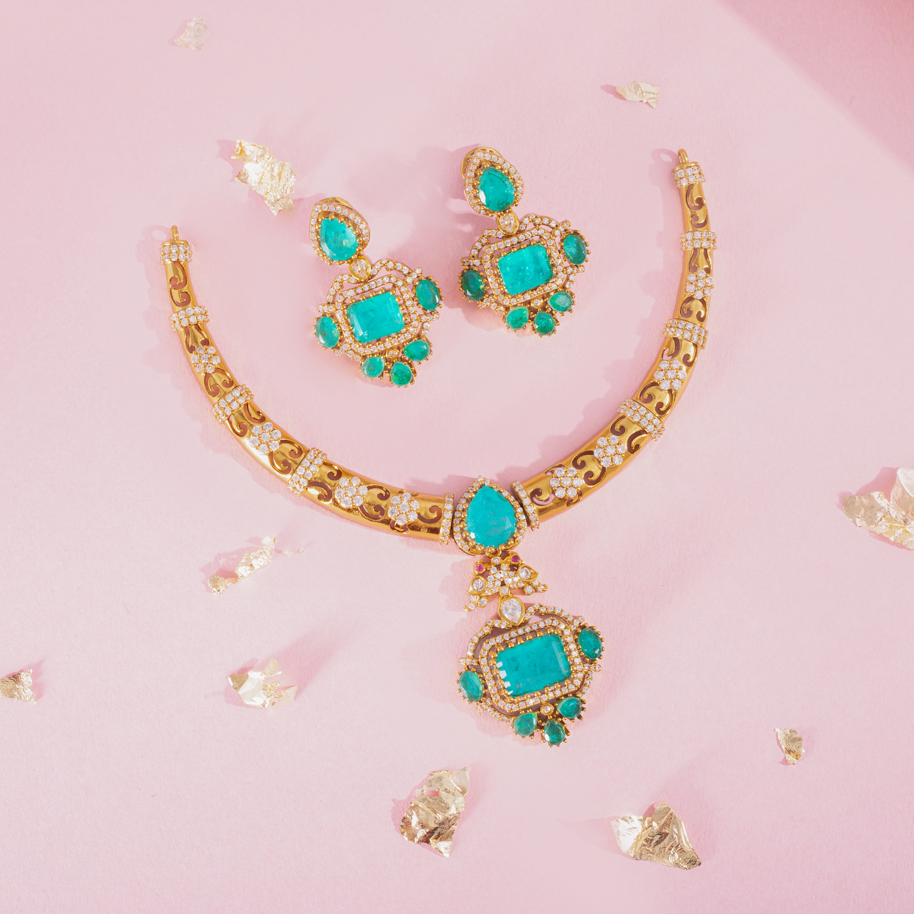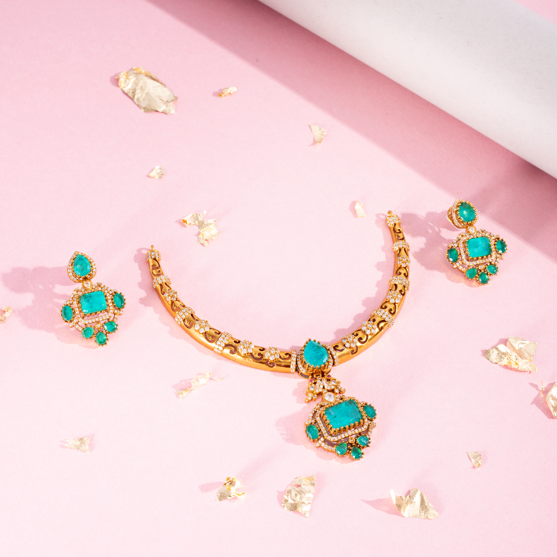 The necklace showcases a regal arrangement of emerald-cut and teardrop stones bordered by shimmering crystals, highlighting the artistry of South Indian craftsmanship. The intricate detailing on the gold plating adds a touch of antique charm, while the matching earrings complete your ensemble with grace and balance.