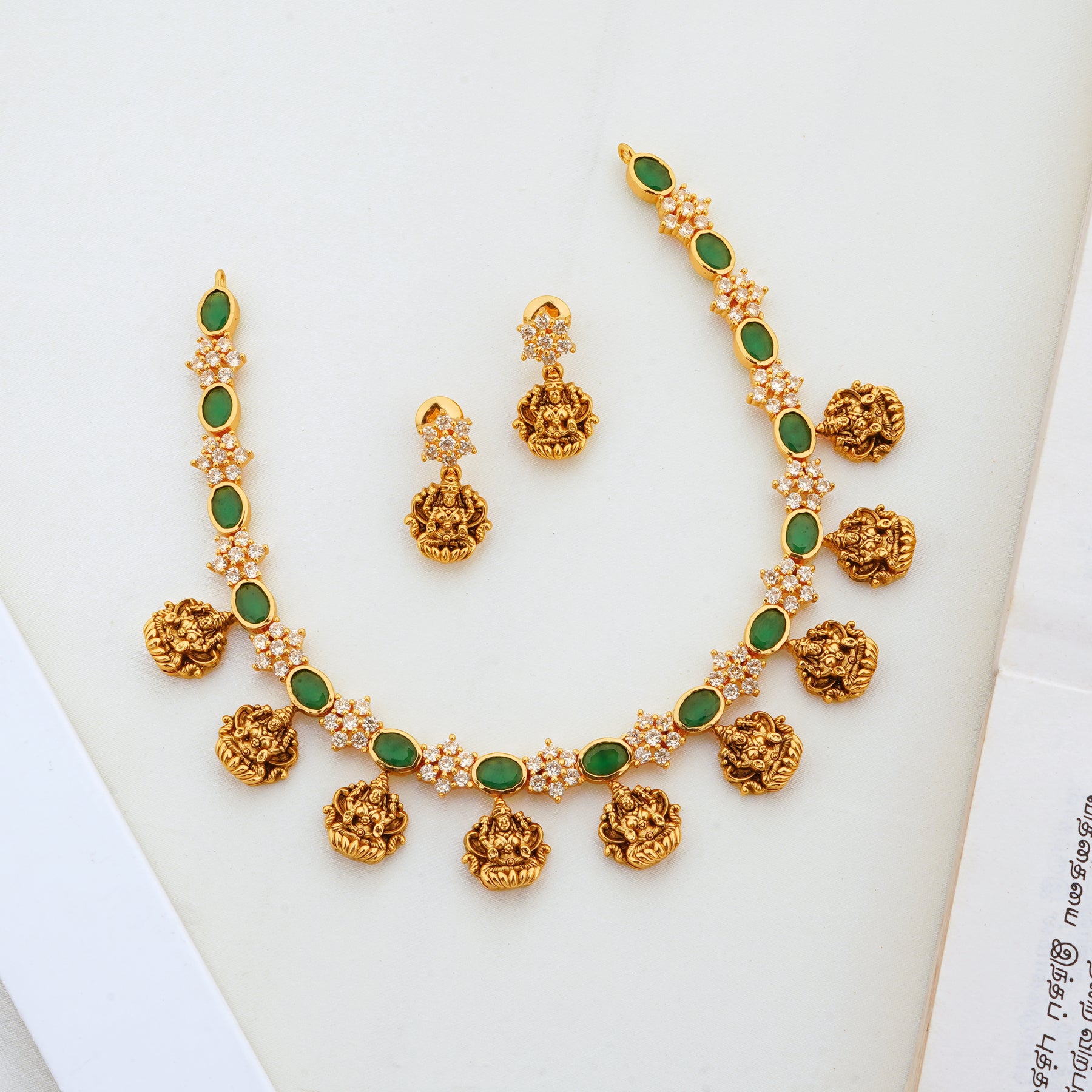 Traditional Gold plated Finish Necklace Set with Emerald and Lakshmi Design