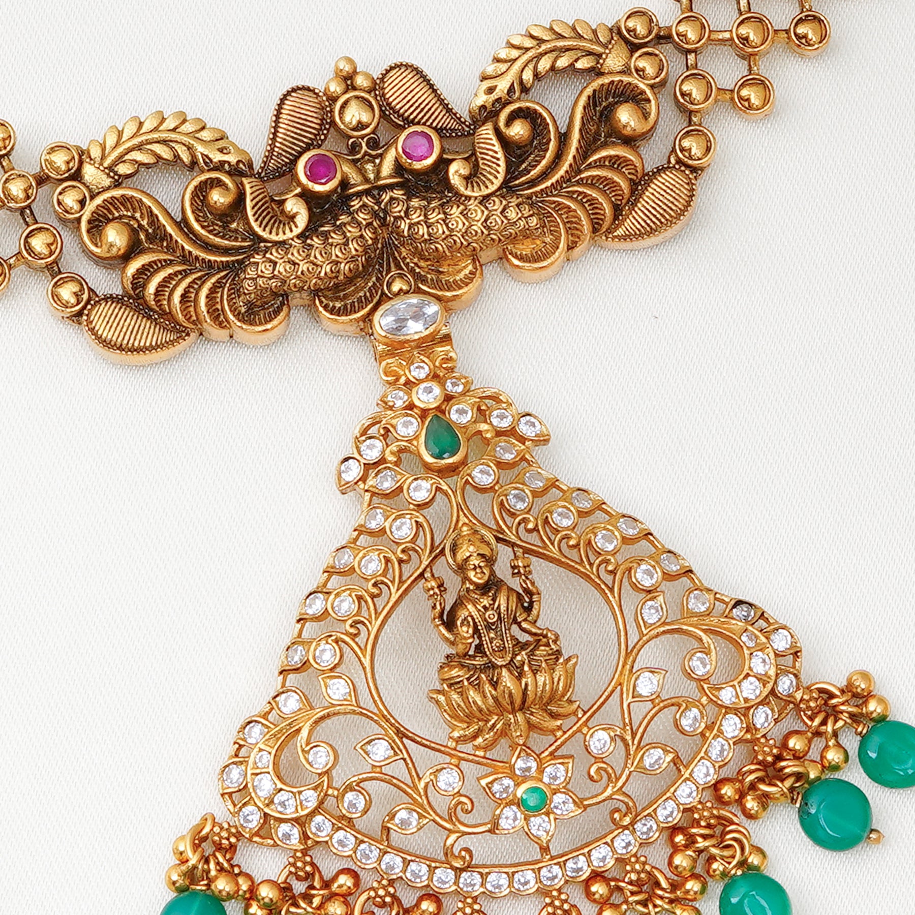 Antique gold Lakshmi pendant necklace with emerald bead hangings