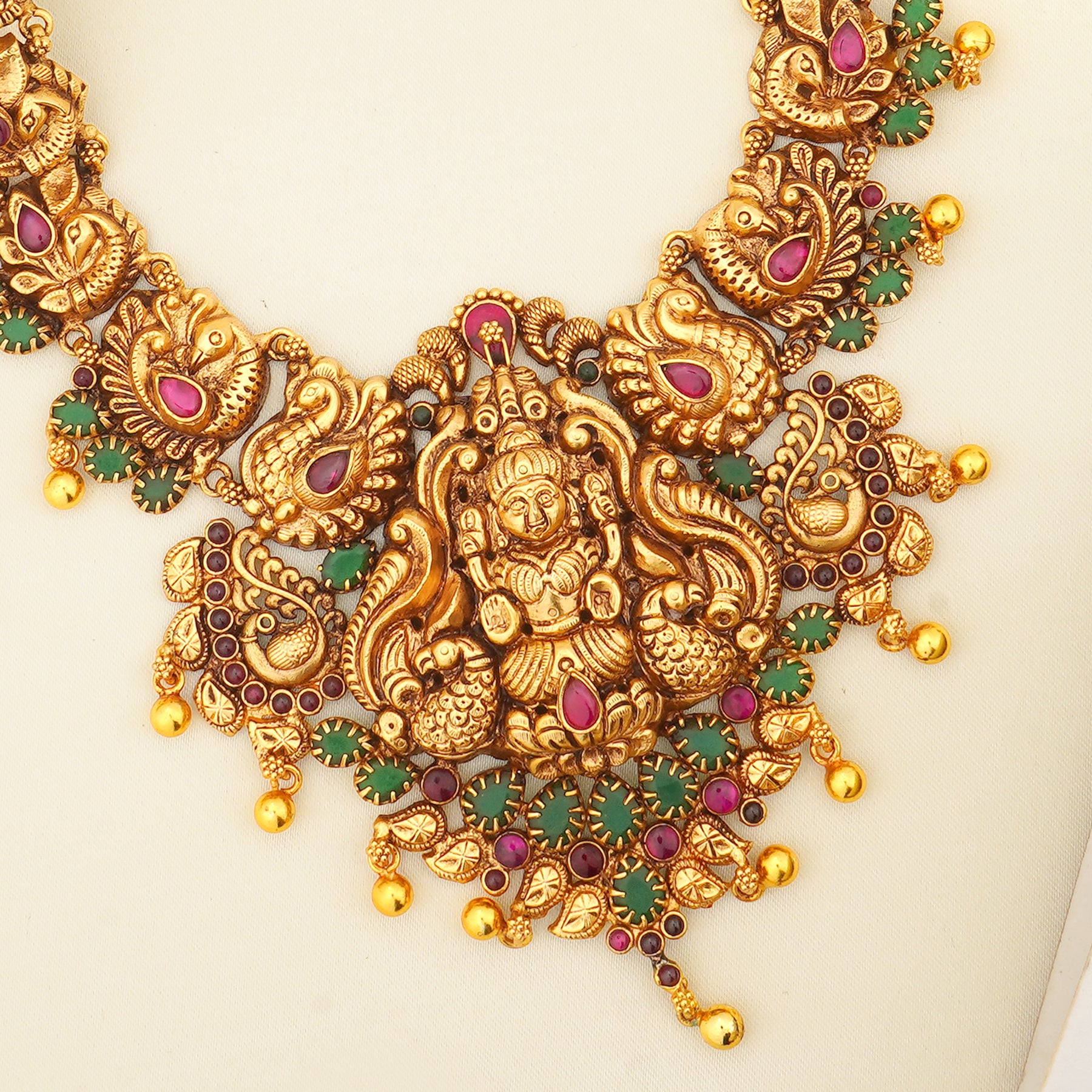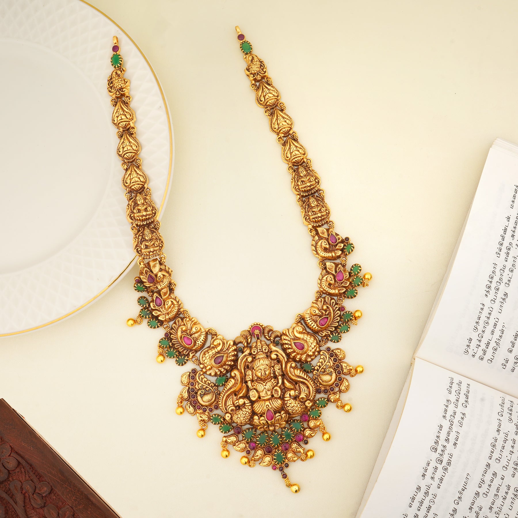 Celebrate divine beauty with this Lakshmi Temple Haram, a masterpiece of traditional South Indian craftsmanship. Made with intricate detailing, the haram showcases Goddess Lakshmi in the centre, symbolizing wealth, purity, and auspicious blessings. Surrounding the centrepiece are majestic peacock and floral carvings, perfectly accented with ruby and emerald stones that lend a vibrant pop of colour.