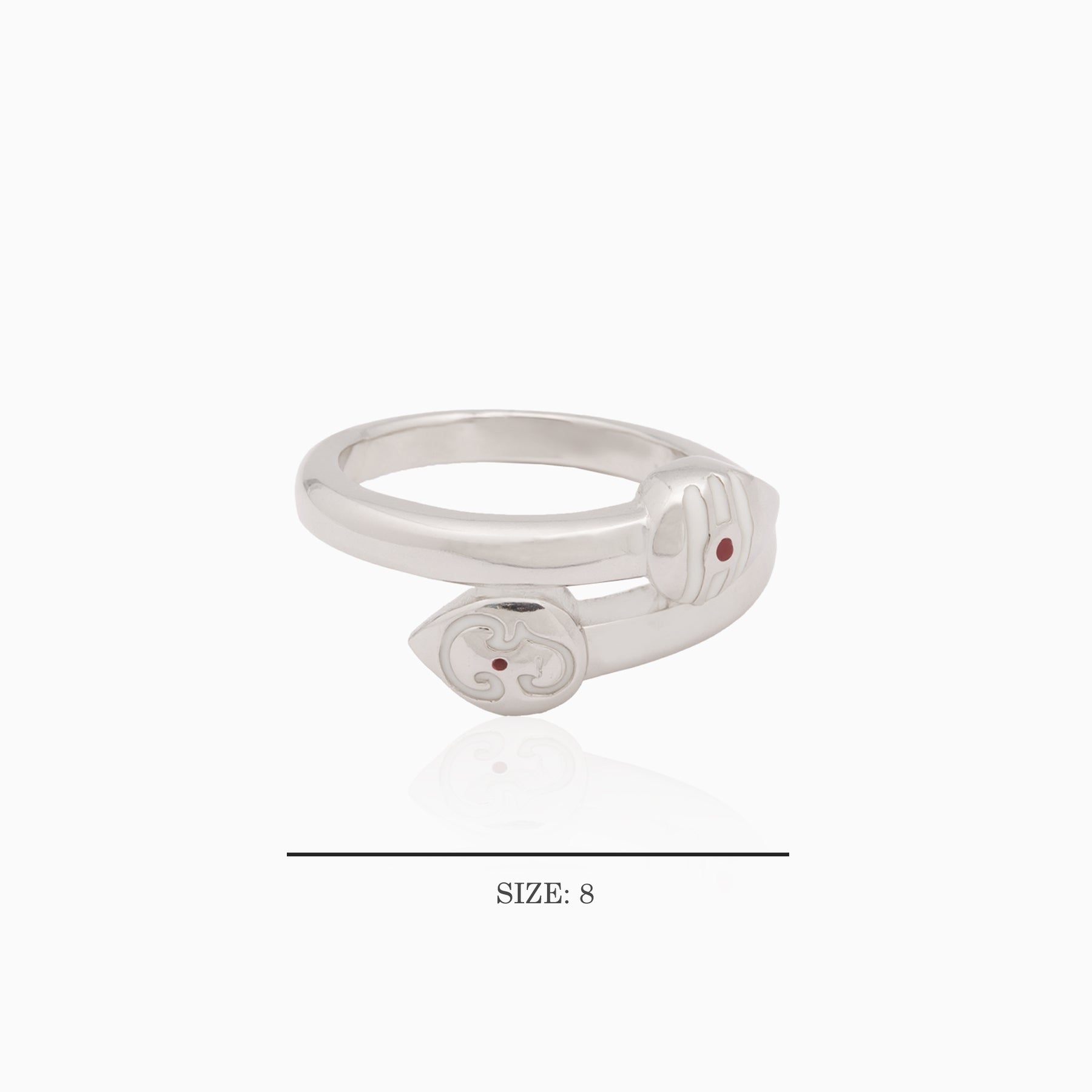 Made from 92.5 sterling silver, this Size 8 adjustable ring features the sacred Vel (spear) of Lord Murugan and an engraved Om symbol, both accented with subtle detailing. The open-ended design ensures a comfortable fit, while the polished silver finish adds a timeless elegance that complements any outfit.