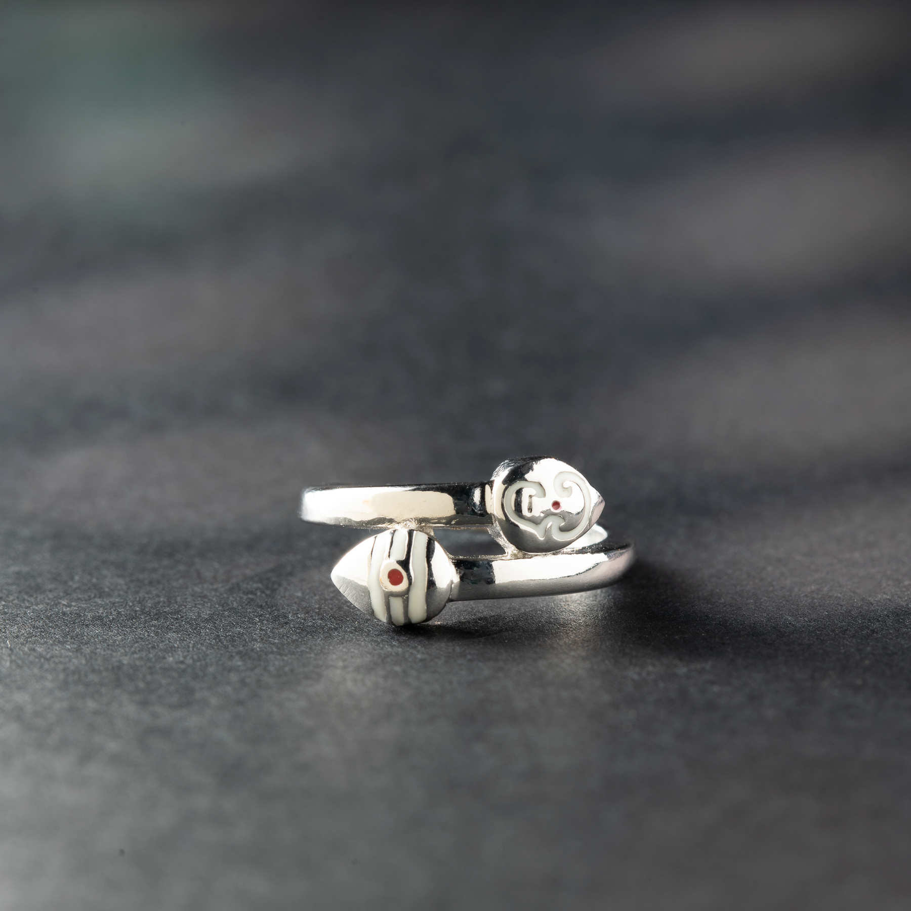 The design blends spirituality with craftsmanship — one end of the ring showcases the Murugan Vel with a red enamel accent representing divine energy, while the other features the Om symbol, representing universal harmony. Together, they create a perfect balance of devotion and strength, embodying the wearer’s connection to Lord Murugan.