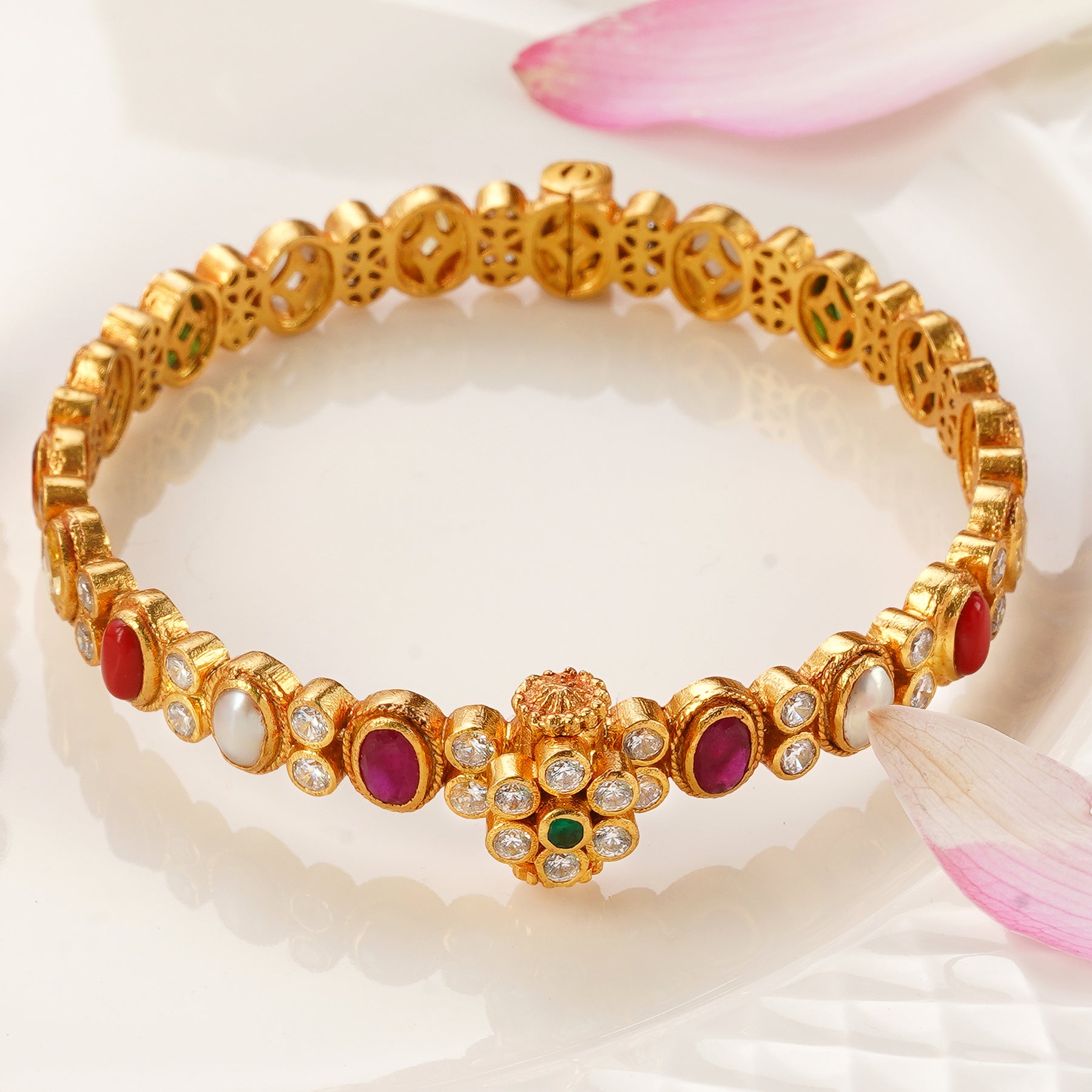 Each stone – ruby, pearl, red coral, emerald, yellow sapphire, diamond, blue sapphire, hessonite, and cat’s eye – is beautifully set, making these bangles not only a fashion statement but also a symbol of positive energy and traditional heritage.