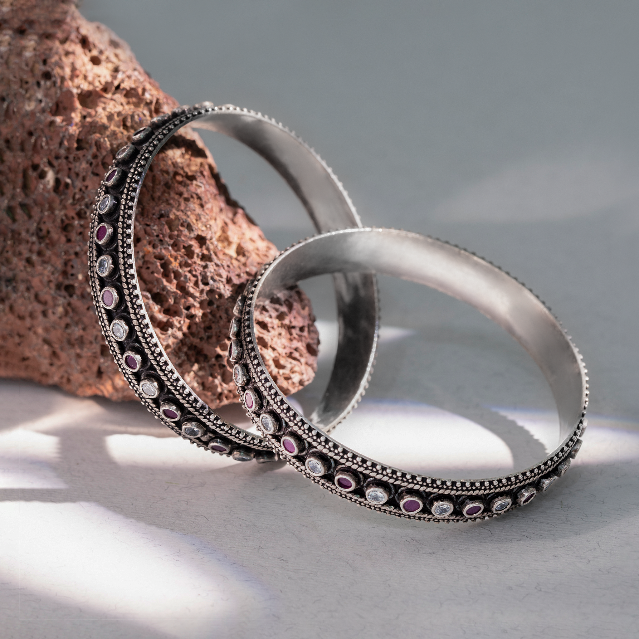 Design: Oxidized silver bangles with red and white stone