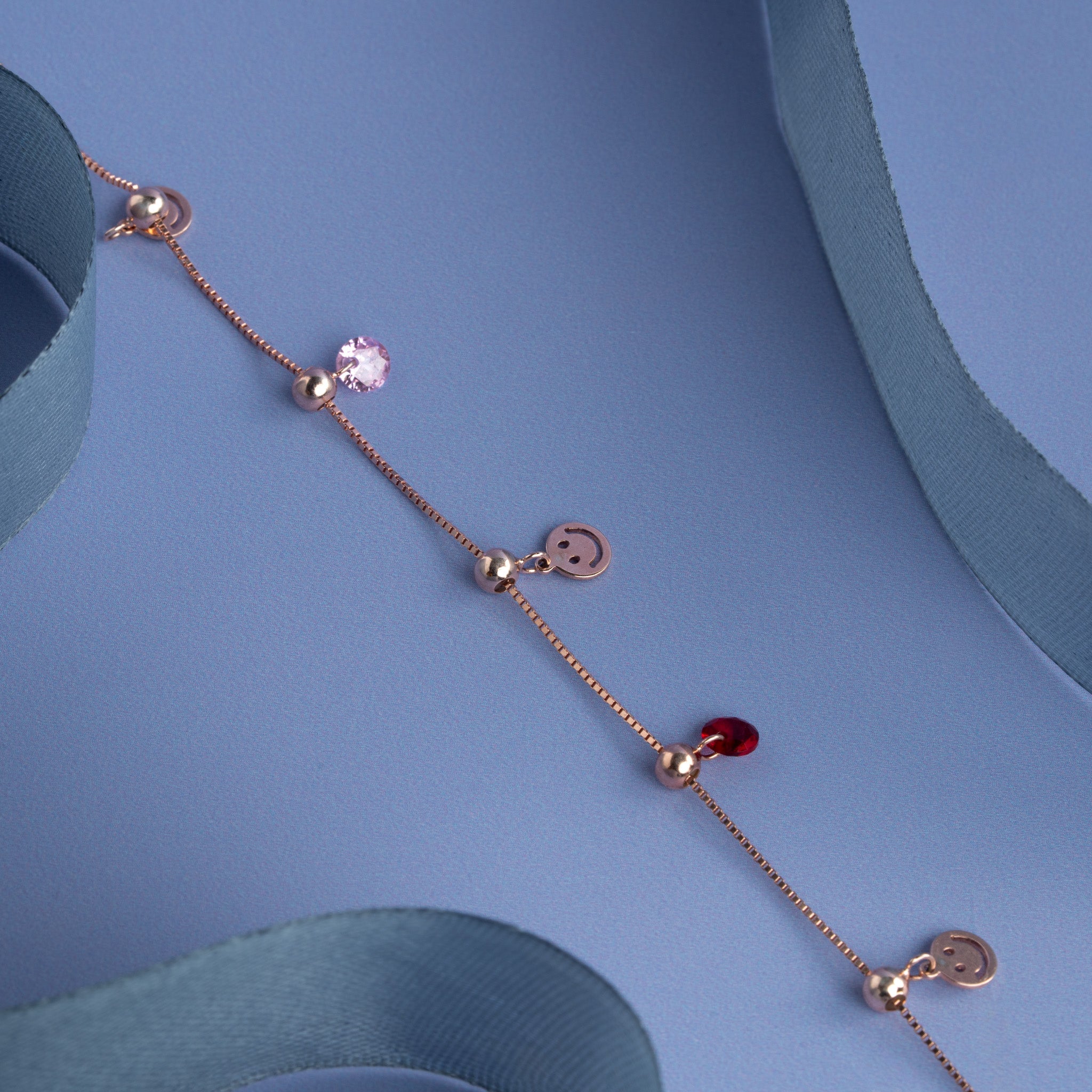 Design: Sleek rose gold-plated bracelet with dangling charms