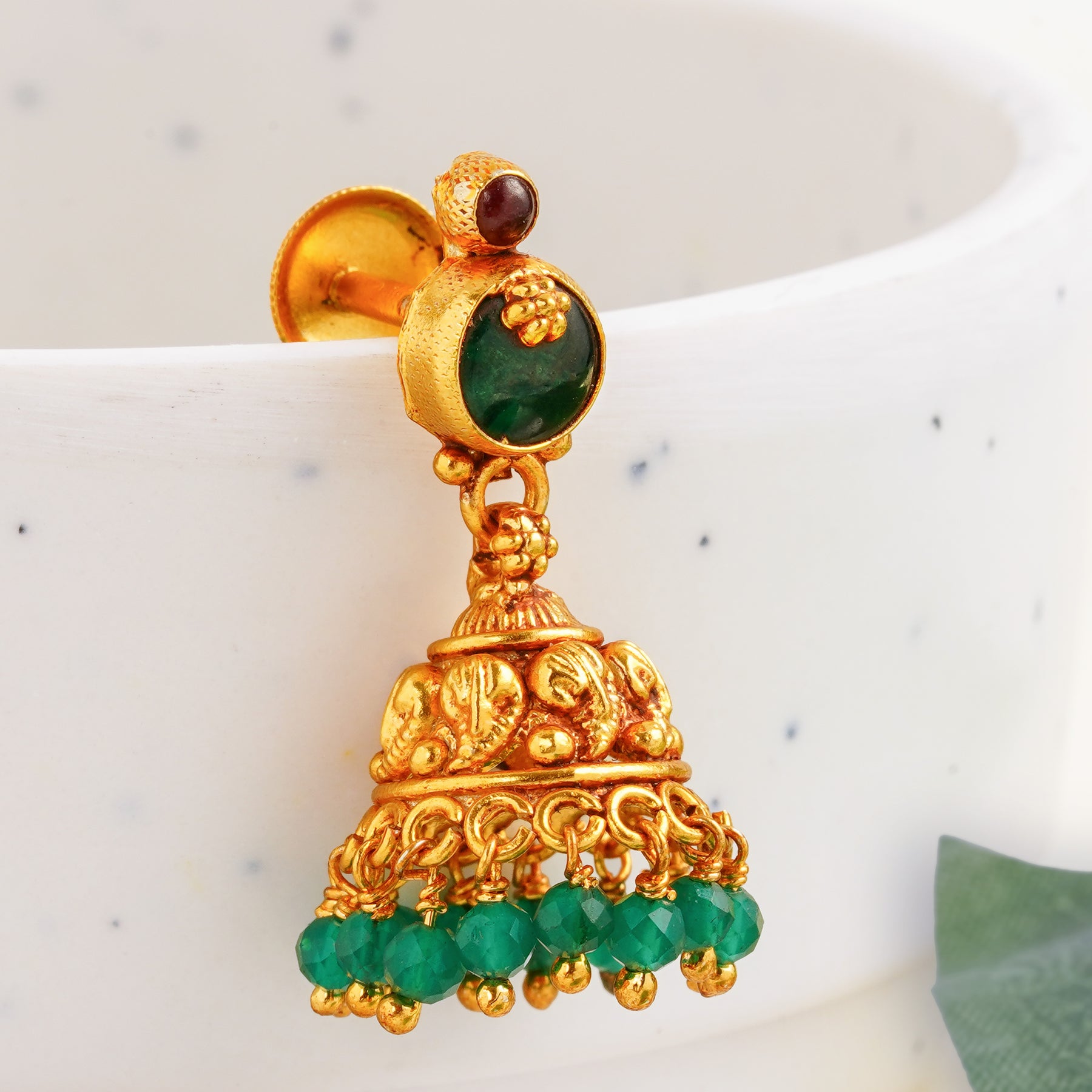 The dome-shaped jhumka is artistically carved with leaf and floral motifs, finished with a cascade of tiny emerald bead droplets that sway gently with every move. Finished in a radiant gold tone, these earrings reflect timeless South Indian craftsmanship.