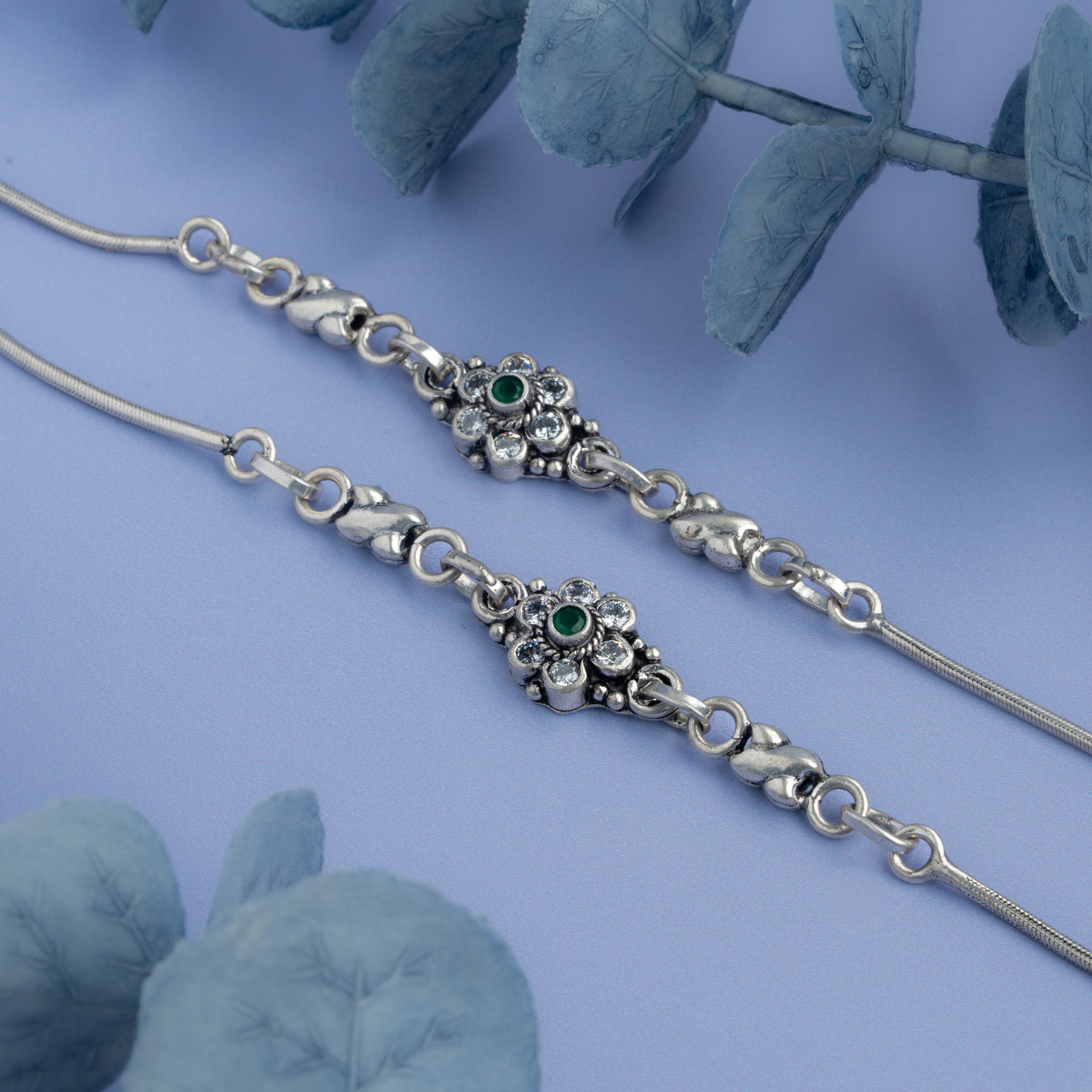 Design: Floral motifs with emerald-coloured centre stones & CZ accents