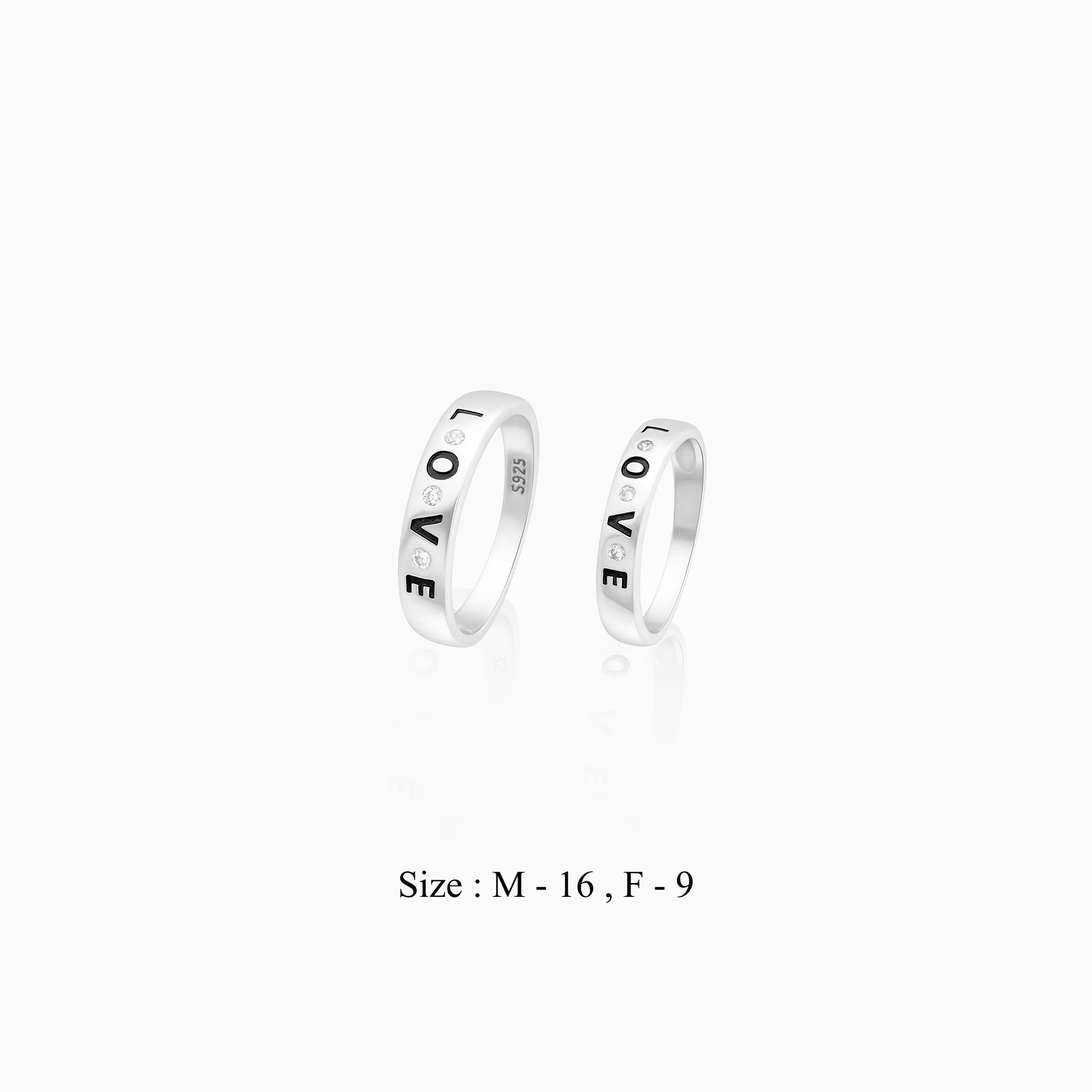 Design: “LOVE” engraved couple rings with CZ stone accents