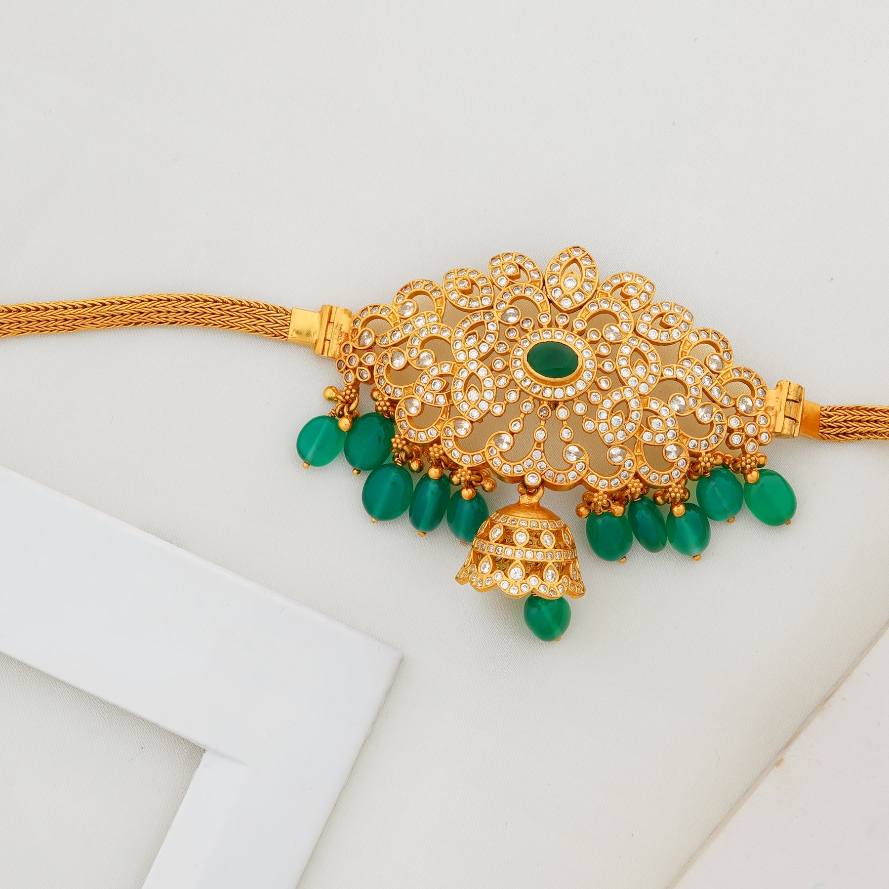 The highlight is the hanging jhumka pendant and green bead drops that enhance the richness and movement of the design. This choker is ideal for weddings, festive celebrations, sangeet nights, or as a standout piece for bridal occasions. The dual mesh chain adds comfort and strength, ensuring it fits snugly and elegantly on your neckline.