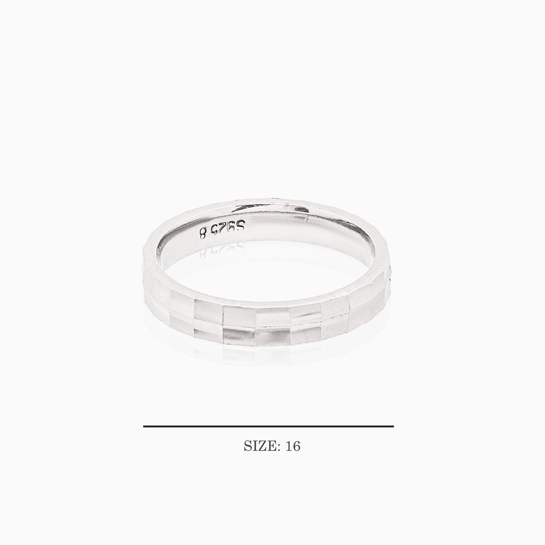 Crafted in 92.5 sterling silver, this Size 16 ring features a refined square-faceted surface that catches and reflects light beautifully, giving the ring a soft yet radiant shine. Its geometric texture adds a modern twist to the classic silver band, making it a versatile piece that suits both men and women.