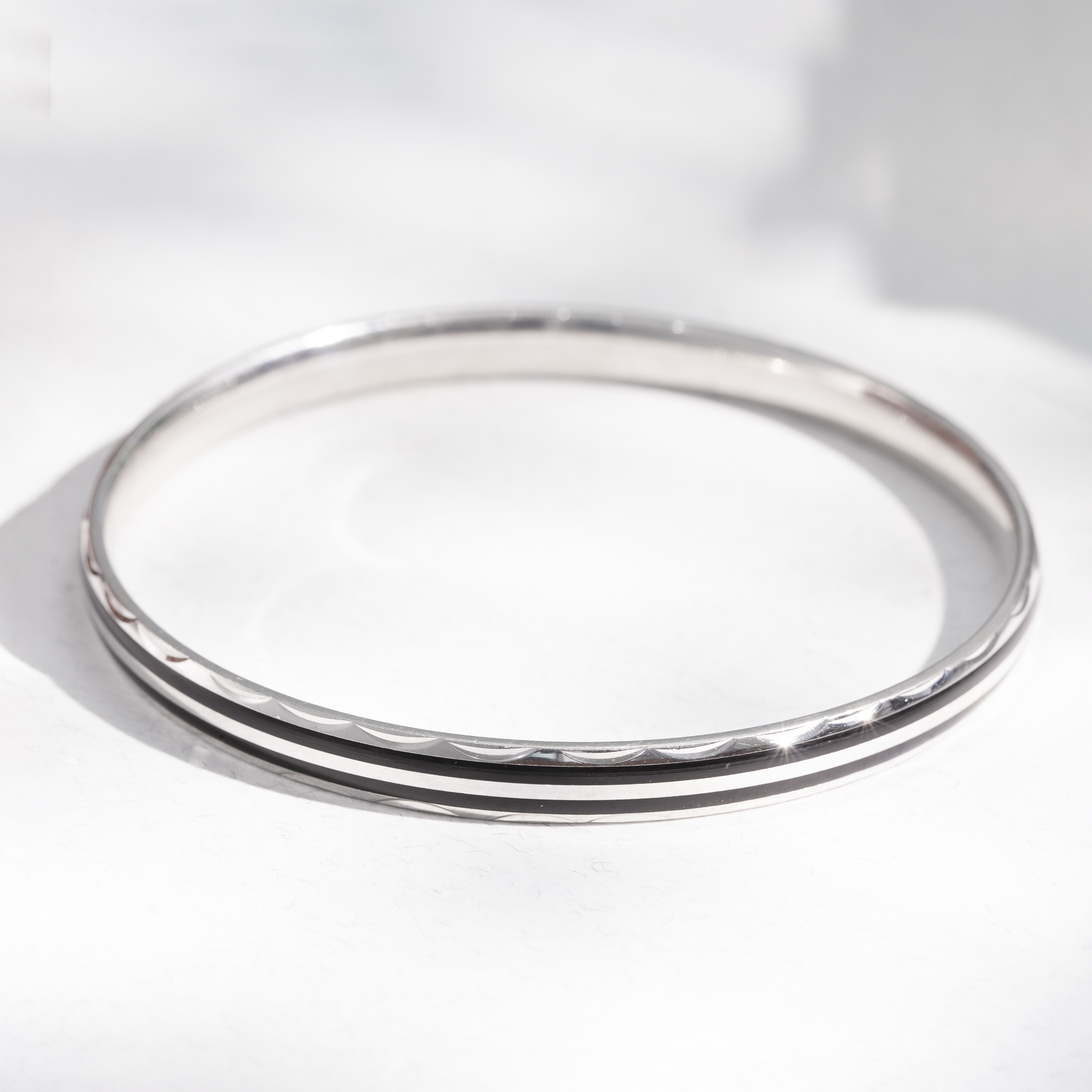 Silver bangle with black enamel stripe