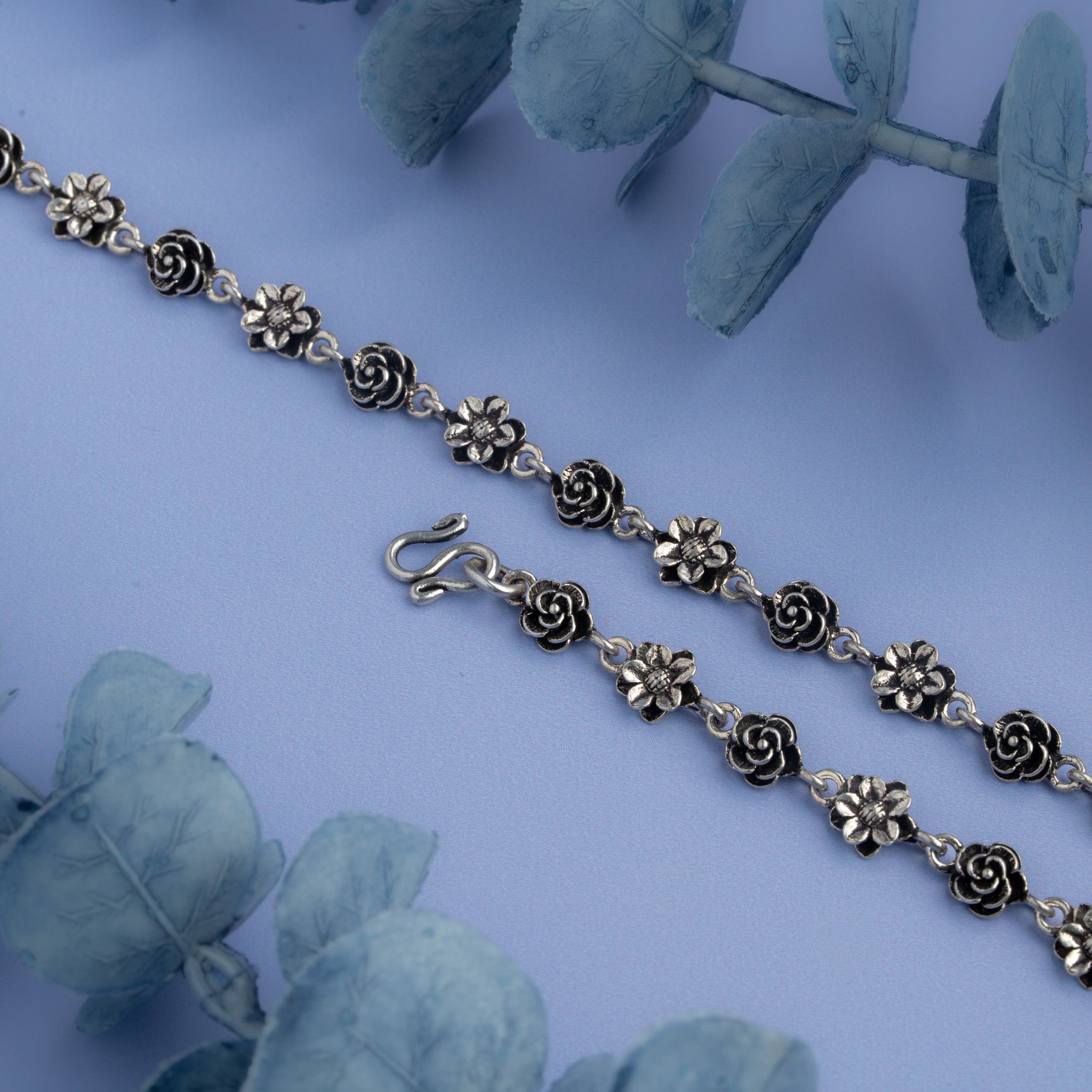 silver floral anklet with rose and flower motifs