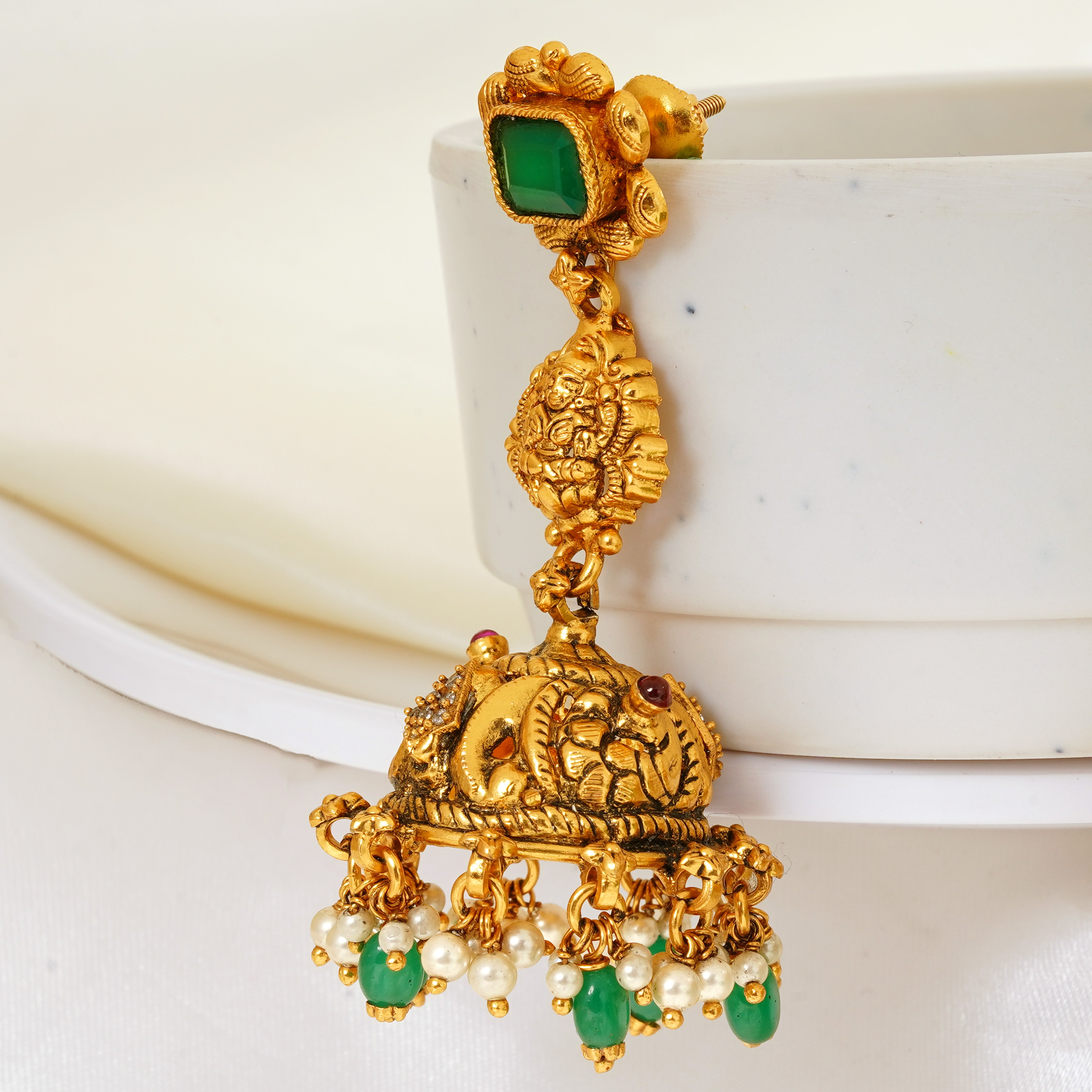 Design: Temple-style long Jimikki with Goddess Lakshmi and elephant carvings