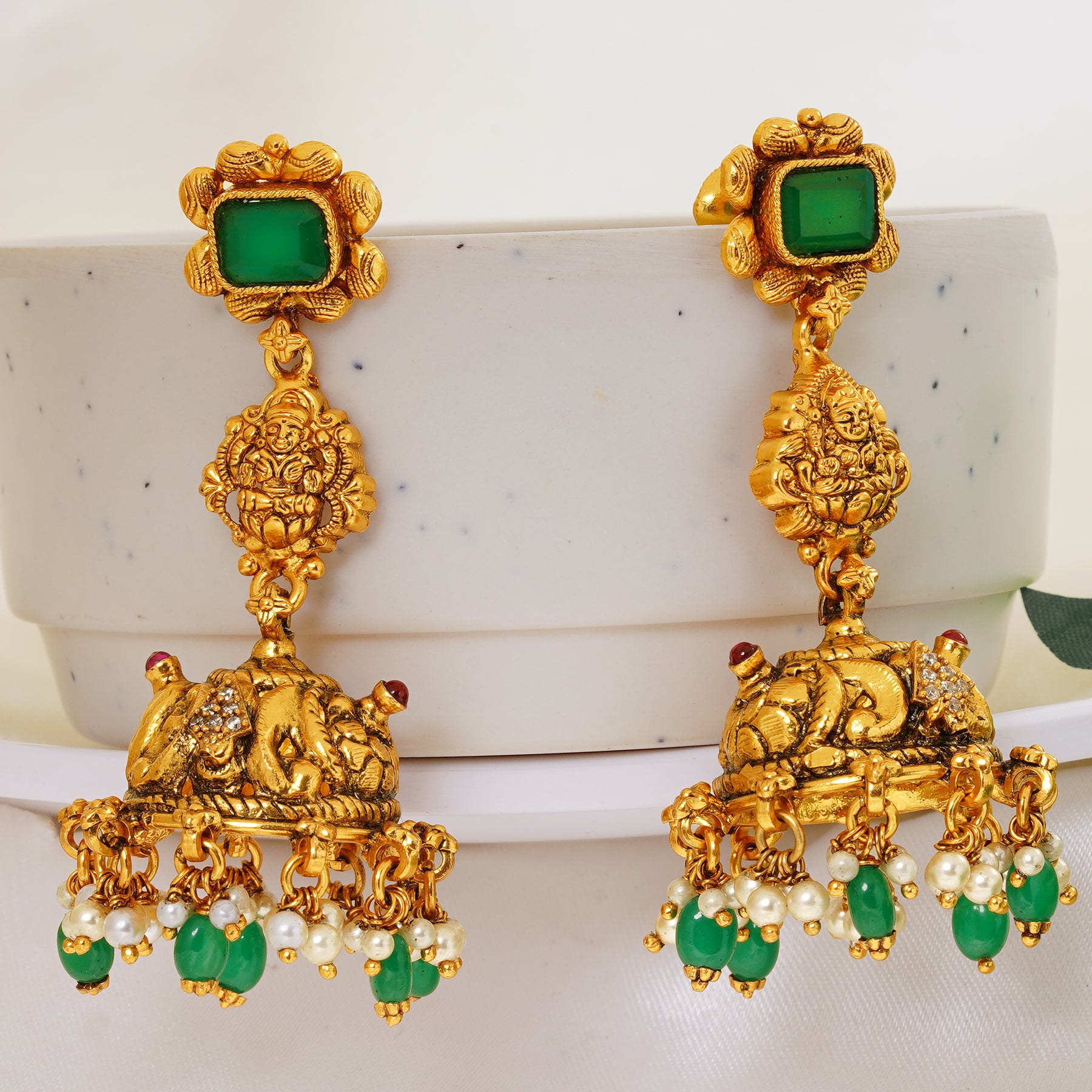 Crafted in an antique gold finish, the earrings begin with a square emerald green stud that sets a regal tone. Below, a beautifully detailed Lakshmi motif is etched in gold, symbolizing prosperity and divine grace. The central dome jhumka is adorned with intricate elephant carvings, adding a royal touch.