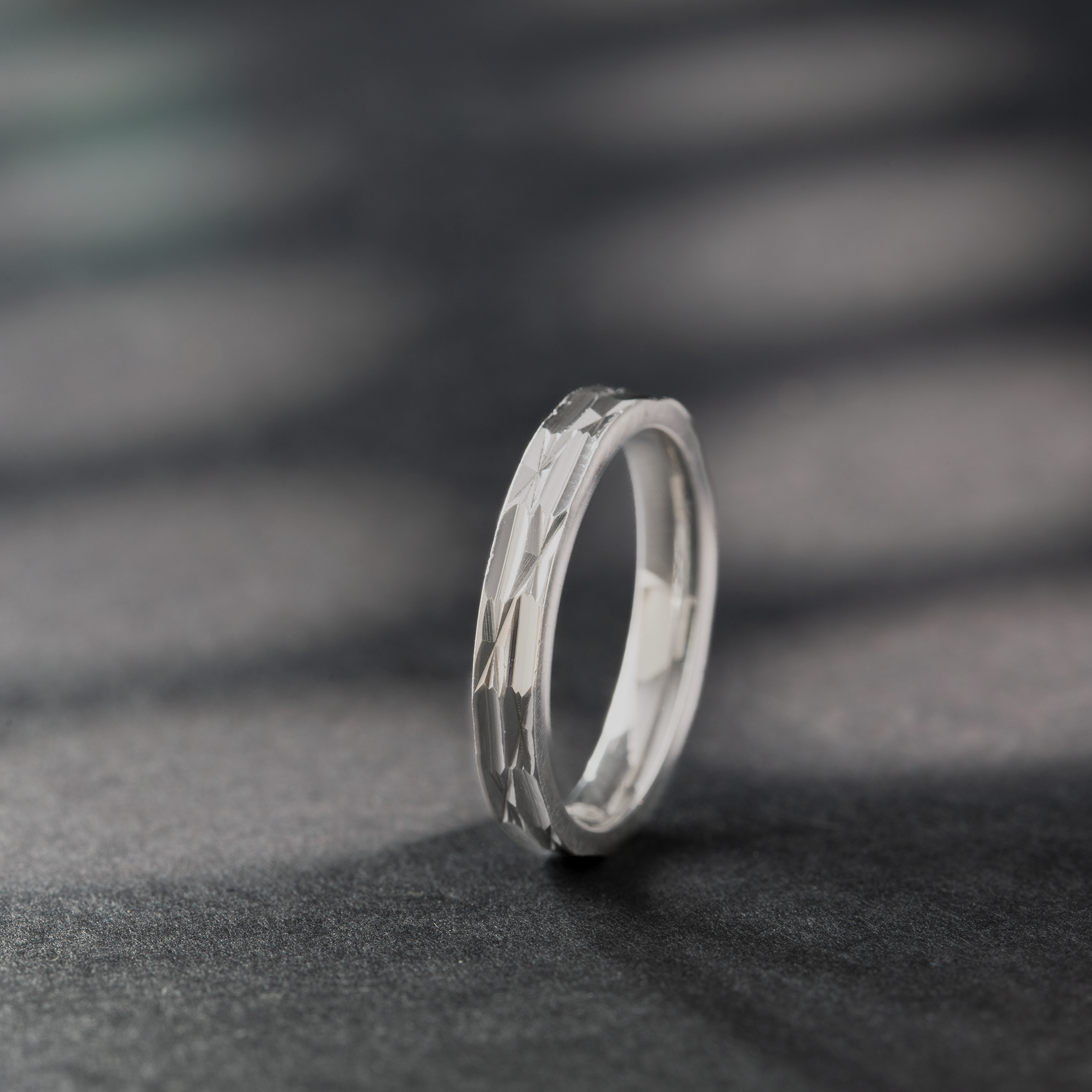 This ring showcases a textured matte surface, designed to reflect individuality and craftsmanship. The irregular, hand-finished pattern enhances its contemporary appeal, offering a bold yet refined look that stands out from traditional polished bands.