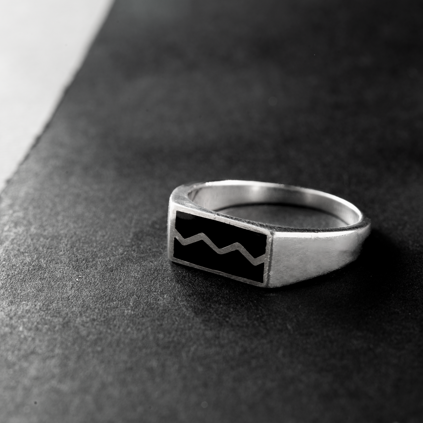 The Urban Edge ring features a rectangular silver frame with a contrasting black inlay that highlights a subtle wave motif — symbolizing flow, movement, and individuality. The design draws inspiration from urban architecture and street aesthetics, giving it a stylish and rugged edge.