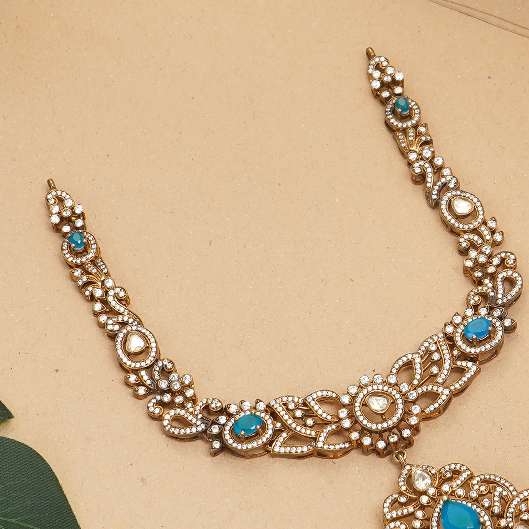 Elevate your ethnic style with this luxurious Victorian Moissanite Stone Necklace with Earrings, expertly crafted in 92.5 sterling silver and lavishly plated in 24K gold. The necklace features intricate detailing with vintage Victorian floral patterns, embedded with sparkling moissanite stones and bold turquoise accents that lend an old-world charm to your modern-day celebrations.