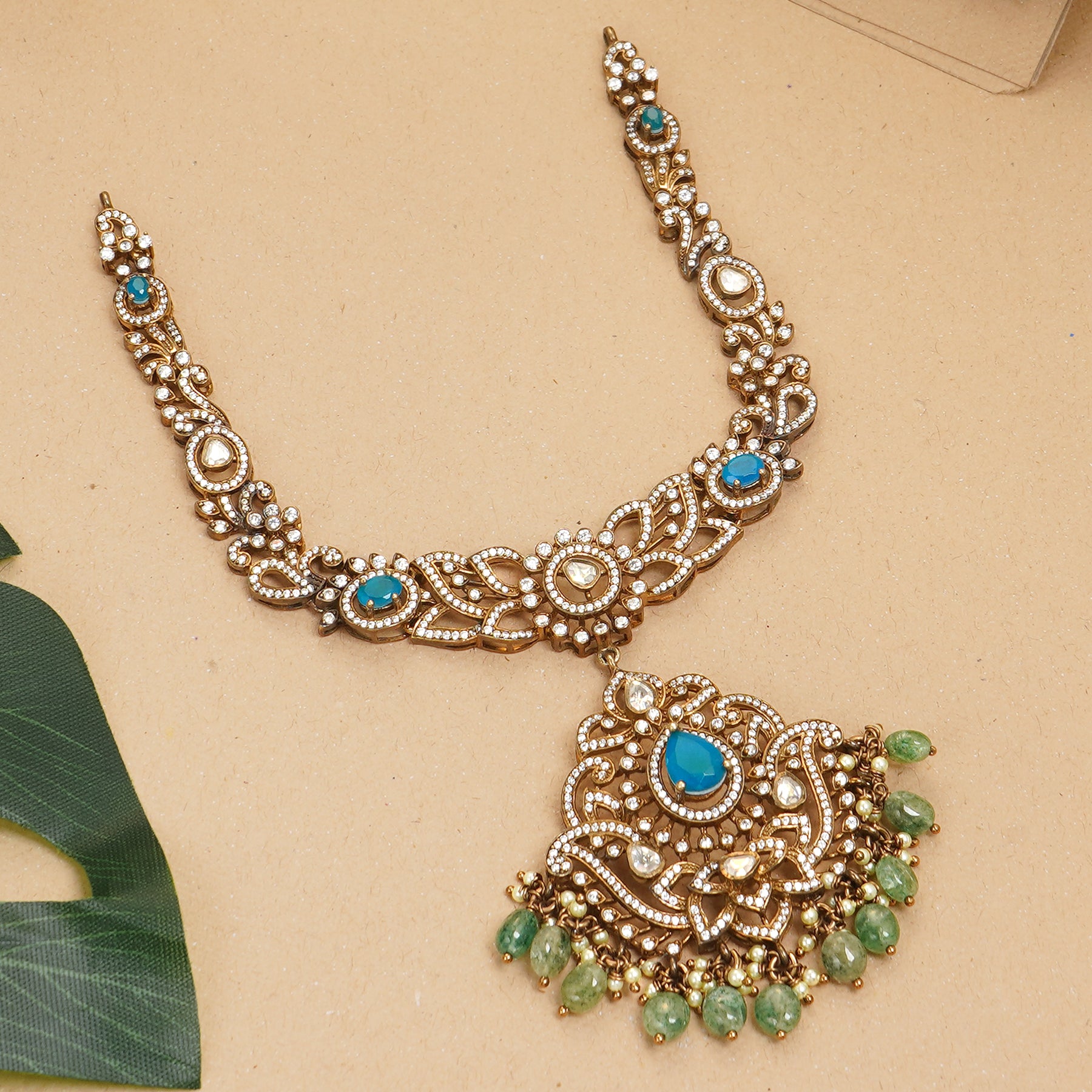 At the heart of the necklace lies a majestic pendant with a teardrop turquoise stone, beautifully framed with miniature moissanites and adorned with clusters of green bead hangings. The matching earrings mirror the grandeur of the pendant, making this a complete set perfect for weddings, bridal functions, or festive events.